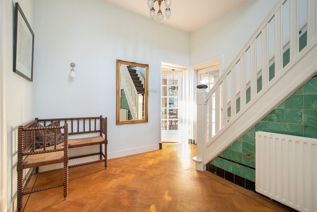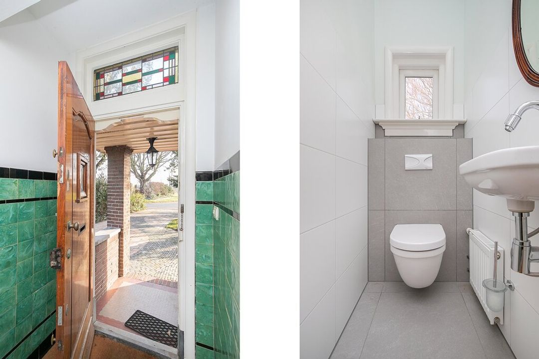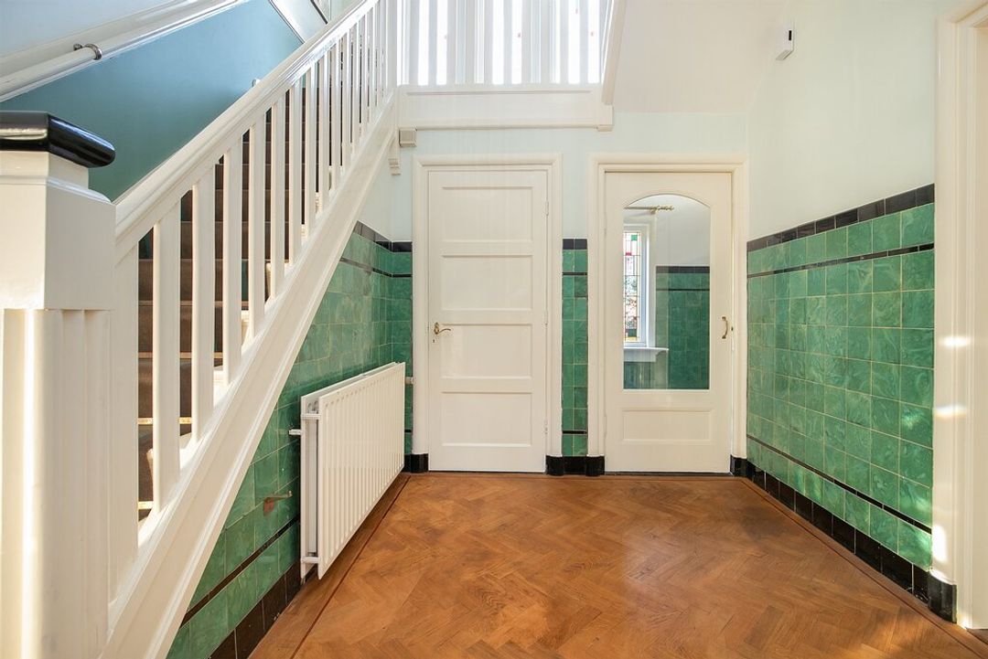 De entree is er een met allure! Aan de rechterzijde van de villa bevindt zich de overdekte entree met toegang tot de prachtige ontvangsthal. Authentieke details zijn behouden gebleven en vormen een uitnodigend decor. Hoge plafonds, strak stucwerk met sierlijsten, hoge plinten en een visgraat parketvloer die doorloopt over nagenoeg de gehele benedenverdieping. De statige trap komt uit op de overloop van de 1e verdieping en vanuit de ontvangsthal is er toegang tot o.a. de toiletruimte en de diverse leefruimtes. Van buitenaf zijn eveneens de inpandige garage en de bijkeuken toegankelijk. In de tuin staat een tweede garage, heeft openslaande deuren, is voorzien van elektra en biedt ruimte aan 2 auto’s.