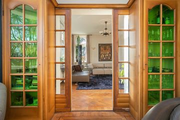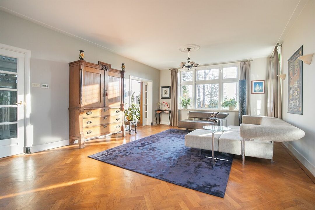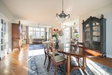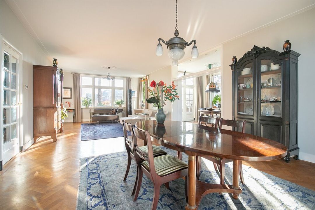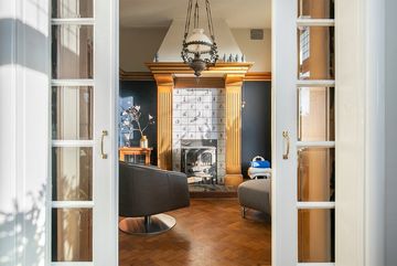De ultieme woonbeleving! Een lichte ruimte met aan de voorzijde hoge ramen en aan de achterzijde openslaande deuren naar het terras. De living heeft een open verbinding met het erkergedeelte, een mooie extra leefruimte met openslaande deuren naar de voortuin. Via de kamer-en-suite deuren is er vanuit de living toegang tot de naastgelegen kamer. Wederom een aangename leefruimte met ronde erker aan de voorzijde en een hoge schouw met houtkachel als blikvanger! Hier droom je weg en word je omarmd door de sfeer van weleer!