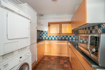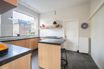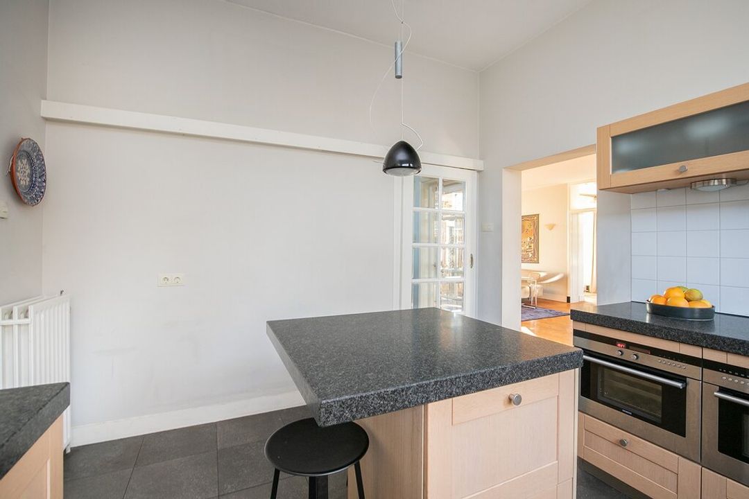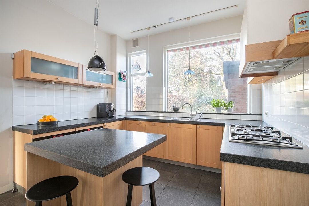 Vanuit de living is er toegang tot de gesloten keuken. Ruim van opzet en door de brede raampartij is er verbinding met buiten. De U-vormige opstelling heeft houtlook panelen in combinatie met een granieten werkblad. Het extra werkgedeelte is een toegevoegde waarde. De opstelling is voorzien van diverse, luxe inbouwapparatuur waaronder een combi-magnetron, stoomoven, vaatwasser, koelkast, 6-pits gaskookplaat en Quooker. De plavuizenvloer loopt door vanuit de keuken naar bijkeuken.