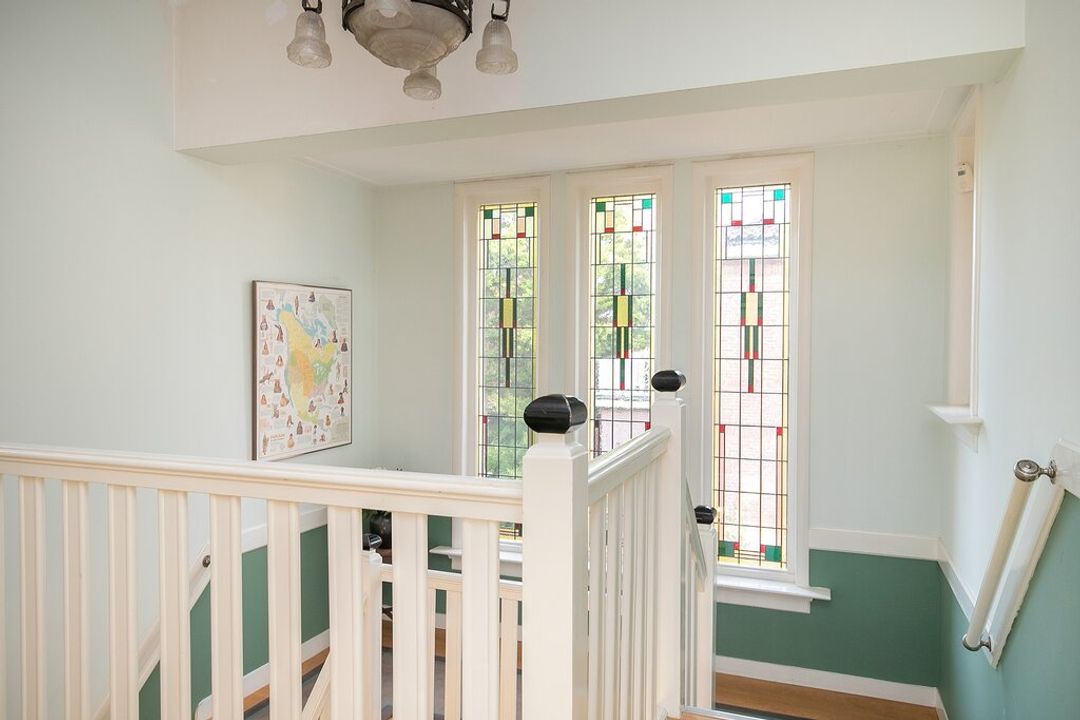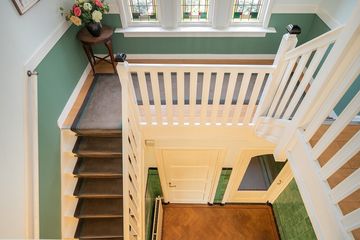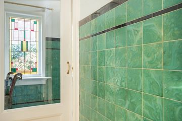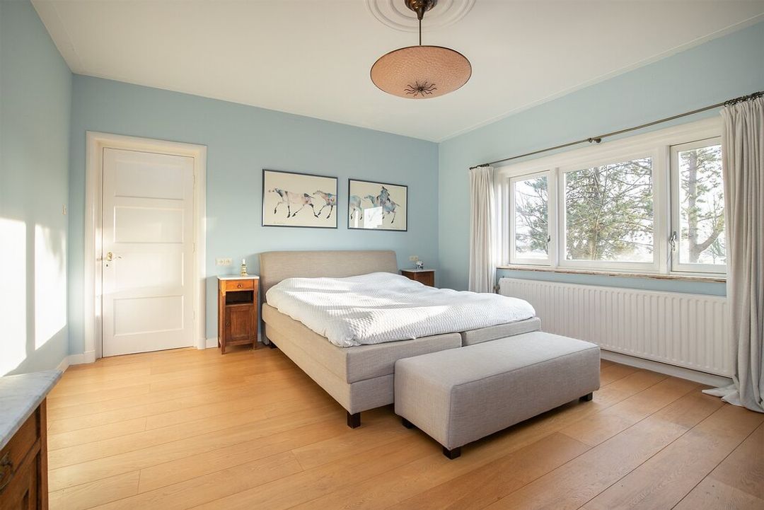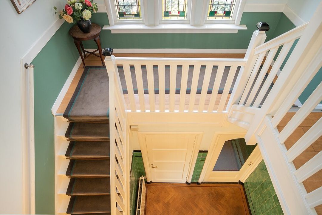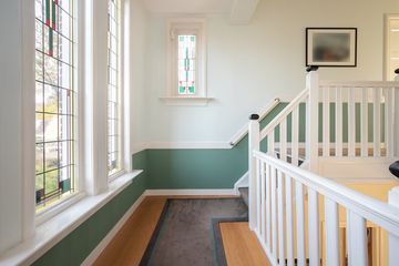 De stijlvolle trap, met traploper, komt uit op de overloop van de 1e verdieping met vide en hoge ramen met glas-in-lood. Op deze verdieping zijn 4 slaapkamers gelegen, de badkamer, de separate toiletruimte en de trap naar de 1e verdieping. De hoge plafonds en de sierlijsten zijn ook hier weer blikvangers! Zowel de overloop als de slaapkamers hebben een parketvloer met eiken toplaag.