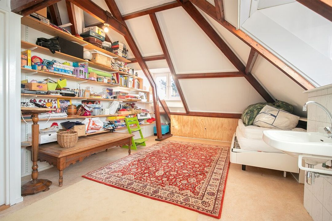 Een volwaardig leefgedeelte door de aanwezigheid van een royale voorzolder met 2 dakkapellen, wastafel en extra bergruimte achter de knieschotten. Fraai detail is hier de zichtbare houten balkenconstructie! Vanuit de voorzolder is er toegang tot de 6e slaapkamer. Deze kamer is ruim van opzet, heeft een dakraam, inloopkast en extra bergkast. De vloer is voorzien van een parket met houten toplaag.