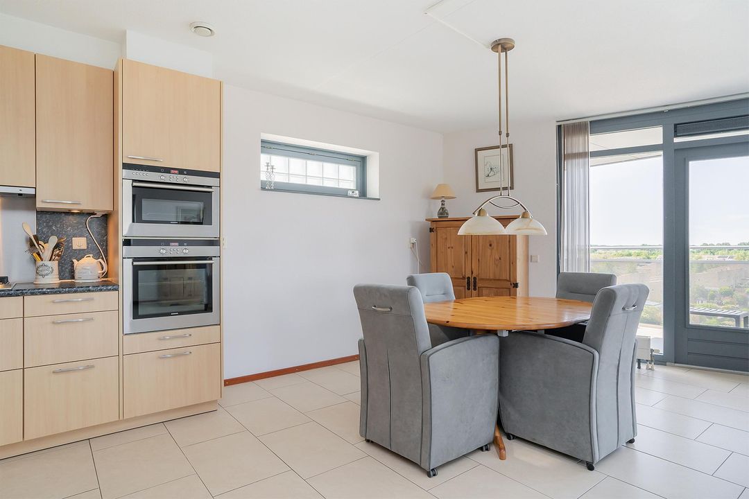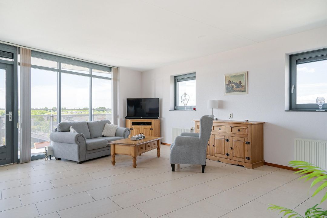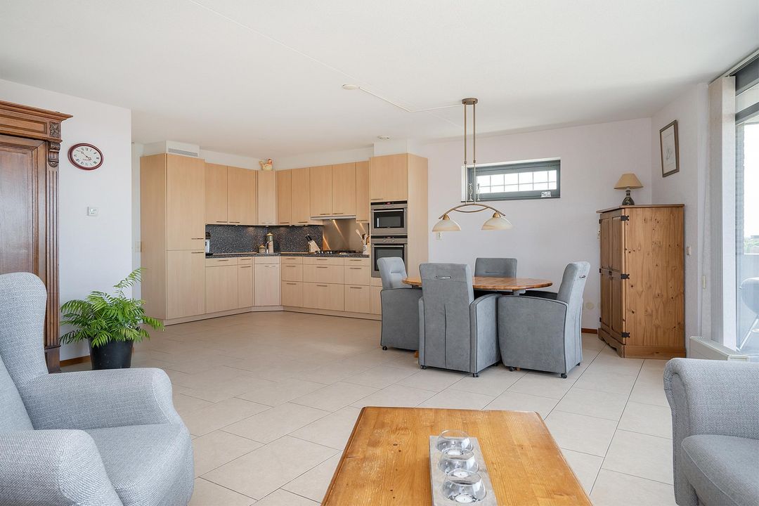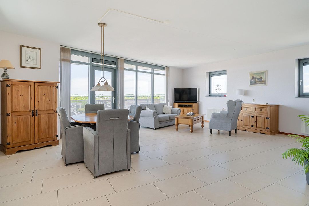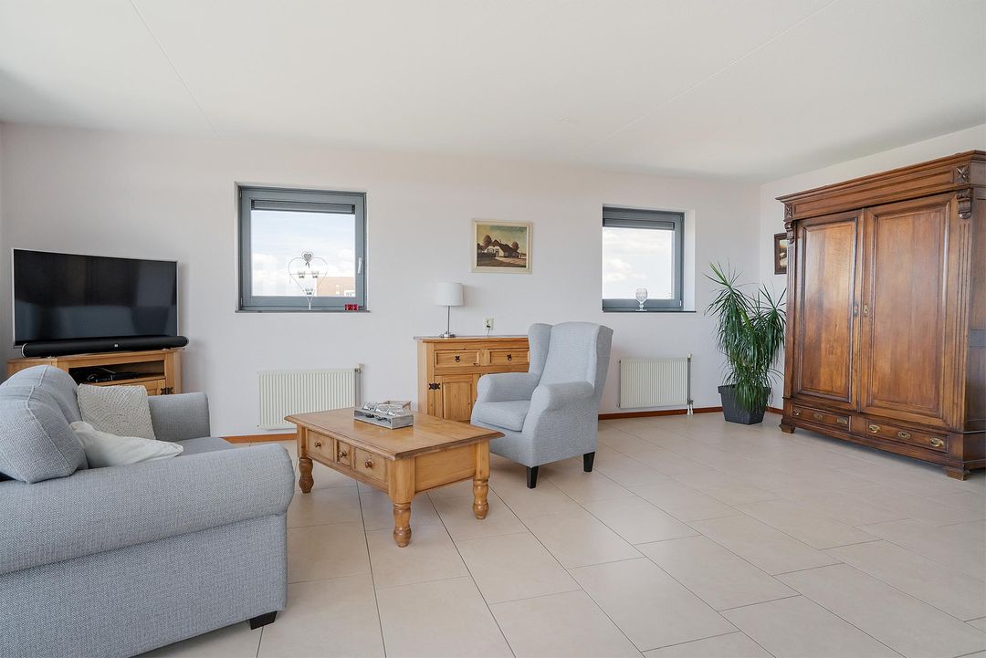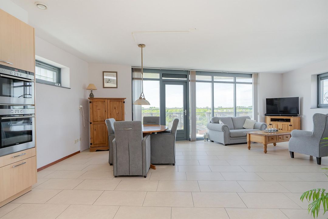 De woonkamer is een prachtige open ruimte die zeer goed wordt belicht door de verschillende grote raampartijen en de loopdeur naar het balkon. Op het 14m2 grote balkon is het echt genieten geblazen! Het is gelegen op het noordwesten en heeft een prachtig uitzicht over de ‘Boseilanden’.