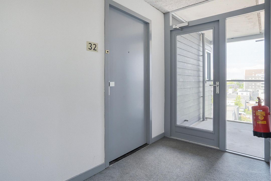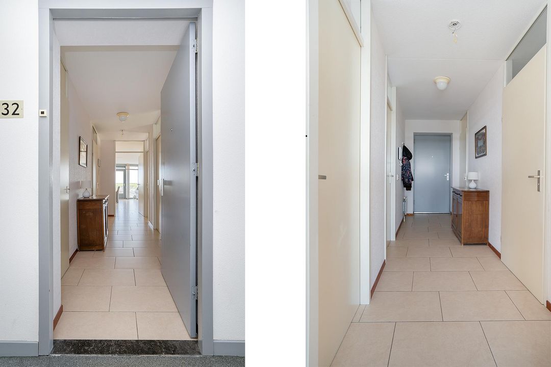 Het appartement bevindt zich op de 5e verdieping van het complex. Middels de voordeur betreedt u de ontvangsthal met toegang tot de woonkamer, 2 slaapkamers, de badkamer en de waskast met cv-installatie (Agpo 2003). De lichte tegelvloer is vanuit hier doorgelegd over het gehele appartement, aan de wanden is er gekozen voor licht behang.