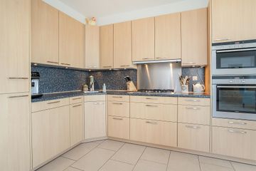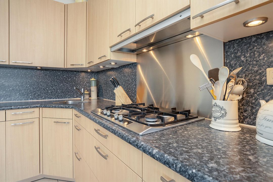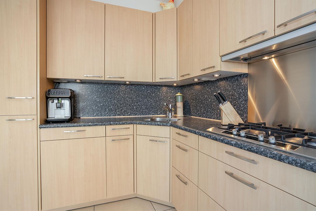 Daarnaast heeft de woonkamer een open verbinding met de ‘SieMatic’ leefkeuken met een royale L-opstelling. Hierdoor heeft u aan werk- en opbergruimte absoluut geen gebrek! De opbergkasten zijn voorzien van eikenhouten panelen en verschillende inbouwapparatuur. Zo is er een koelkast, een vriezer, een vaatwasser, een combi-oven, een afzuigkap en een oven aanwezig. Het antracietkleurige kunststof werkblad heeft een rvs-spoelbak en een 4-pits gasfornuis. Zoals u leest is deze prachtige keuken van alle gemakken voorzien!