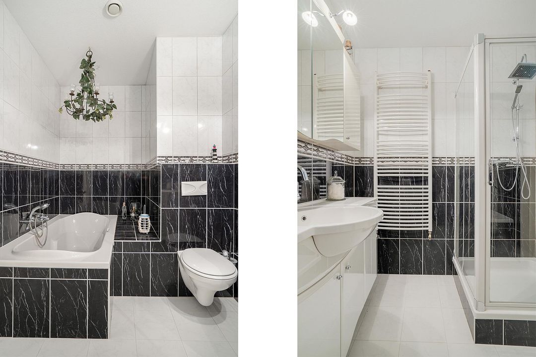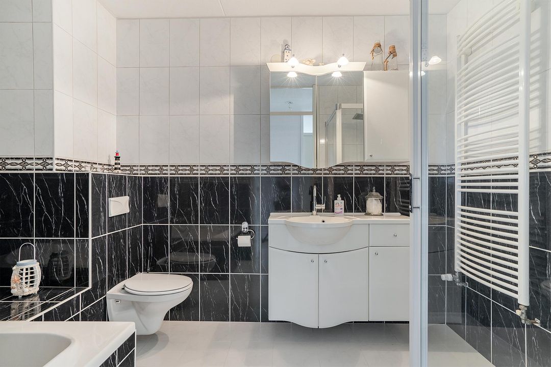 De badkamer is volledig betegeld met een combinatie van licht- en zwart marmere vloertegels. Daarnaast is ook de badkamer van alle gemakken voorzien! Zo is er een ligbad, een douchecabine, een badkamermeubel met wastafel, een designradiator en een toilet aanwezig en kunt u de ruimte eenvoudig ventileren middels het mechanische ventilatiesysteem.