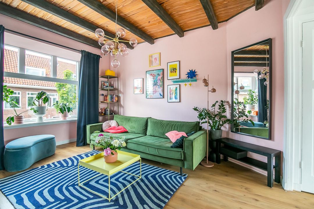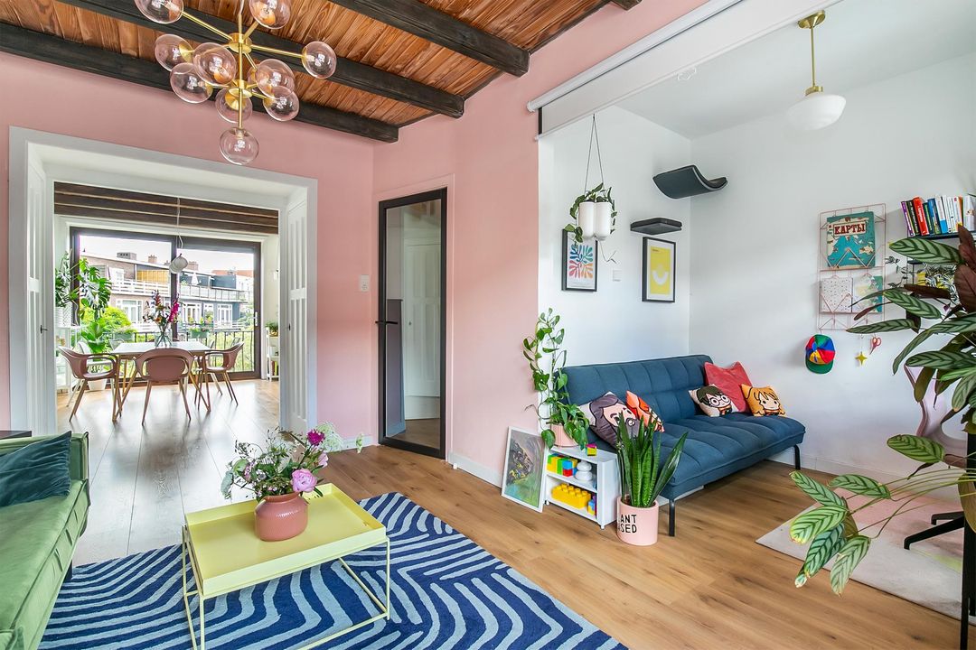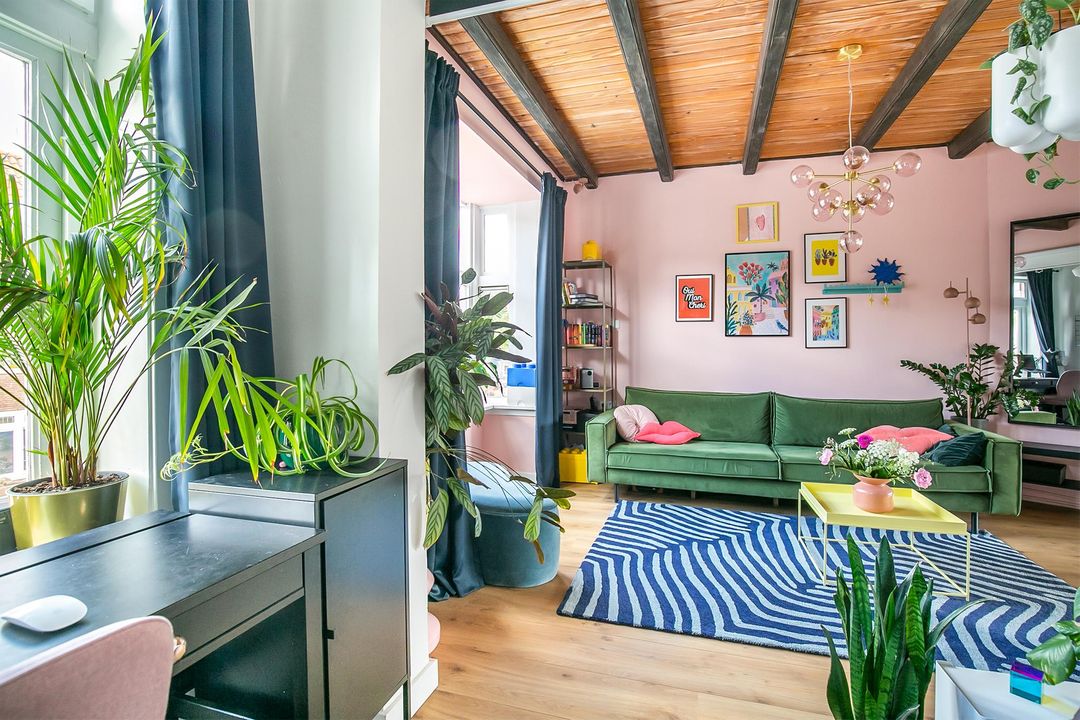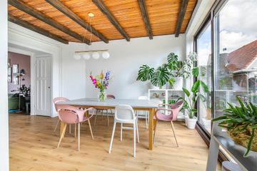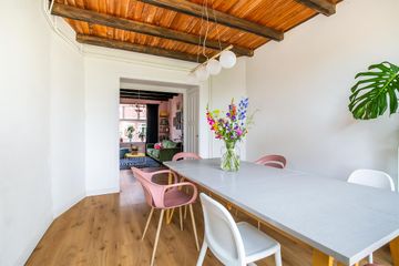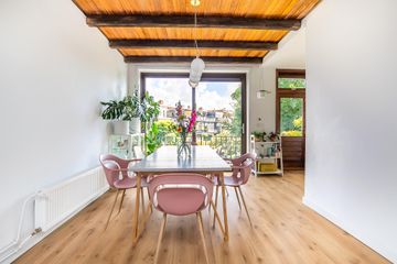 De woonkamer heeft een praktische indeling met meer dan voldoende ruimte voor een zit- en eetgedeelte. Aan de voorzijde van de woning heeft u een erkertje en heeft u toegang tot een open (werk)ruimte. De lichtroze afwerking aan de strak gestucte wanden, in combinatie met het houten balkenplafond geven de woonkamer een zeer warme uitstraling!