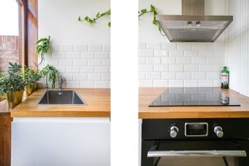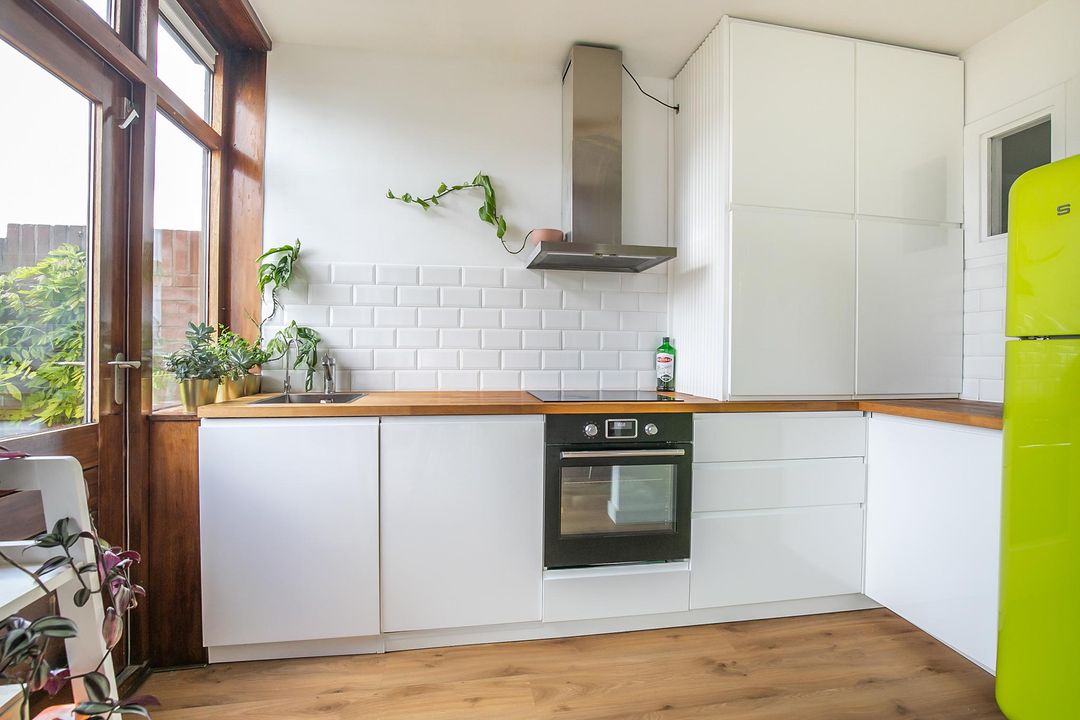 De open keuken heeft een L-opstelling met een houten werkblad. Het werkblad heeft een rvs-spoelbak en een inductiekookplaat met rvs-afzuigkap erboven. De vele opbergkasten hebben strakke witte panelen die de keuken een moderne uitstraling geven. De opbergkasten zijn voorzien van verschillende inbouwapparatuur. Zo heeft u een: vaatwasser, een oven en is ook de Intergas (2019) cv-installatie netjes in deze kasten weggewerkt.