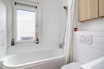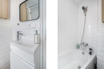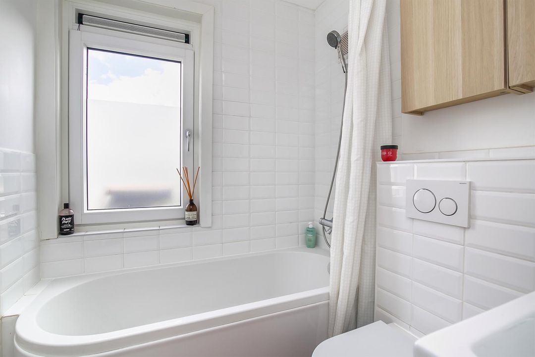 De badkamer is vrijwel geheel betegeld met witte siertegels. Daarnaast is deze ruimte van alle gemakken voorzien. Zo heeft u een design radiator, een ligbad met douche, is er een toilet aanwezig, en heeft u een badkamermeubel met wastafel. U kunt de ruimte snel en eenvoudig ventileren middels het mechanische ventilatiesysteem of via het openslaande raam die de ruimte tevens van daglicht voorziet.