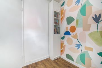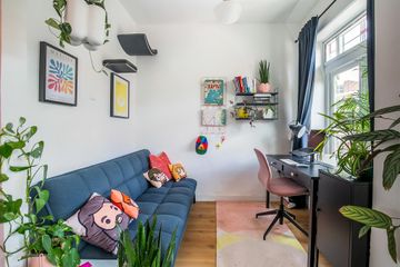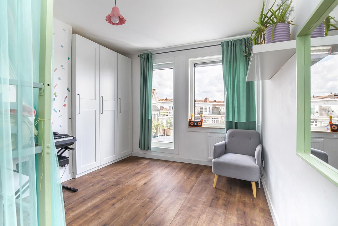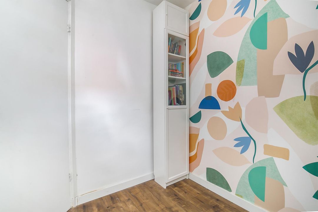 De derde slaapkamer is een volwaardige kamer die u tevens kunt inrichten als walk-in-closet, werk- of kantoorruimte. De kamer heeft een combinatie van sierbehang en wit schilderwerk aan de wanden en heeft een openslaand raam in de dakkapel.