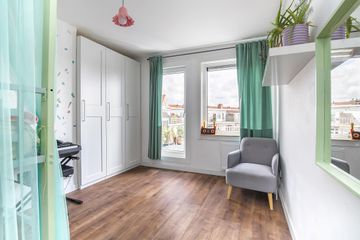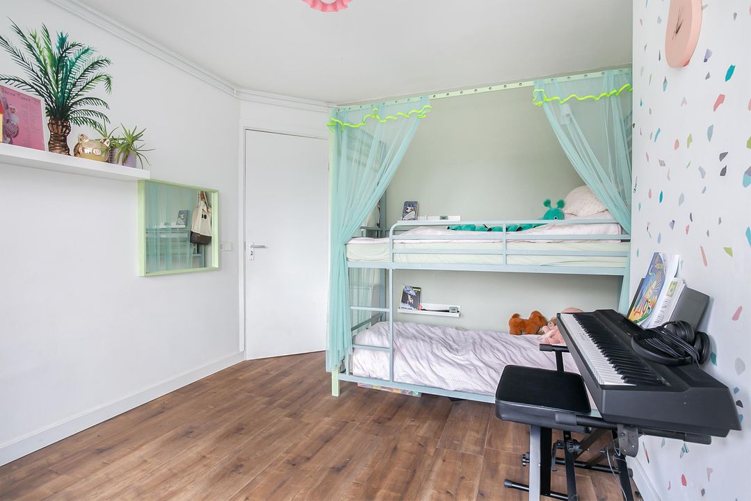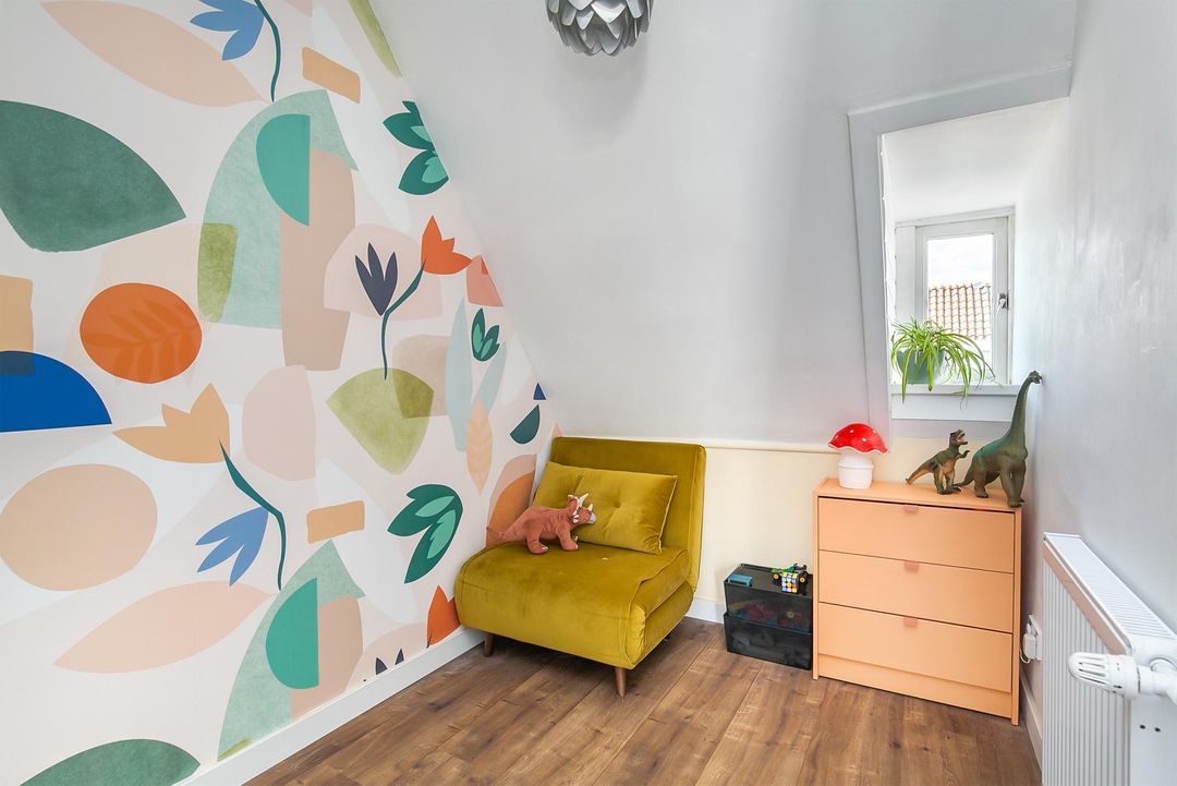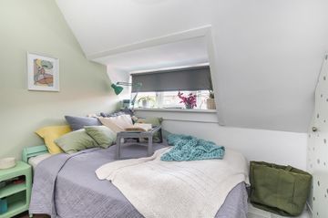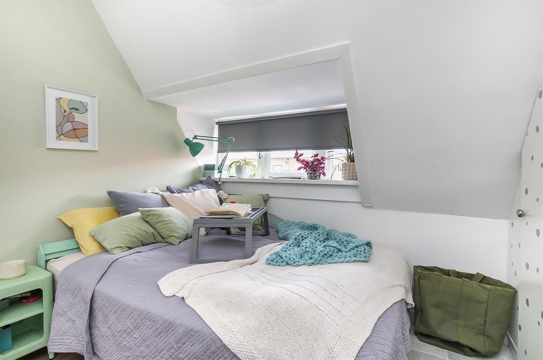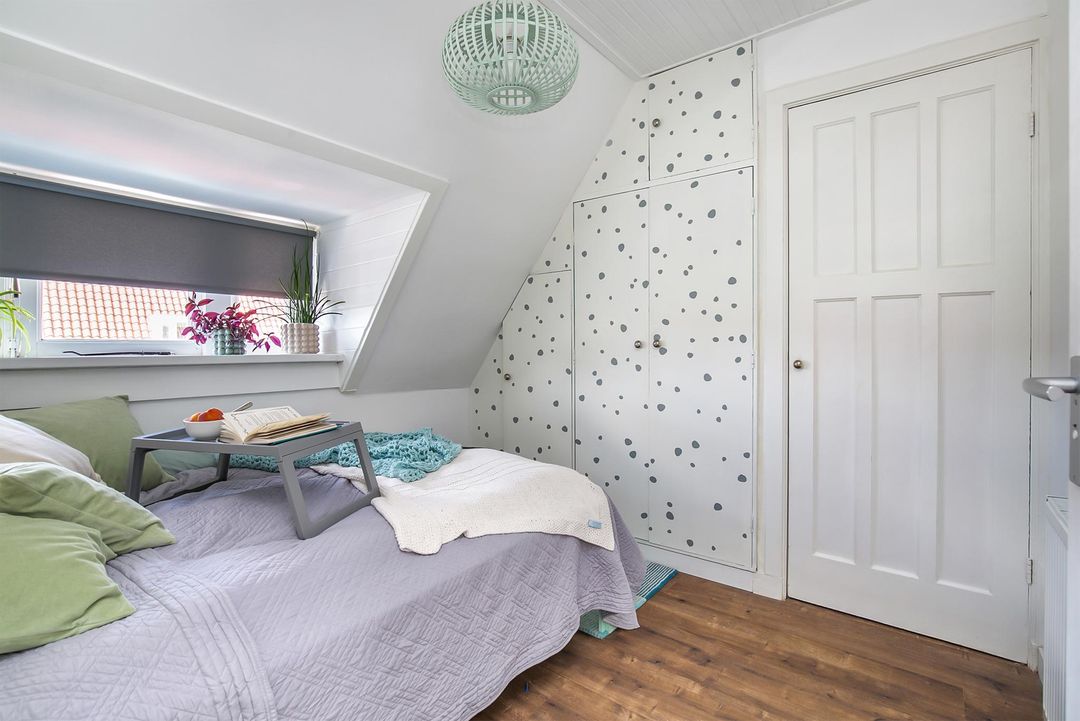 Ook de 2e slaapkamer wordt goed belicht door de aanwezige raampartijen in de dakkapel. De kamer heeft een combinatie van een lichtgroene en witte afwerking aan de wanden. Daarnaast heeft deze kamer een handige inbouwkast voor extra bergruimte of kunt u deze gebruiken als garderobekast.