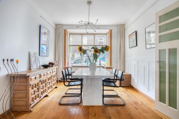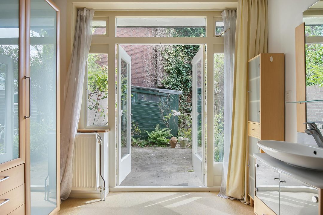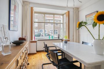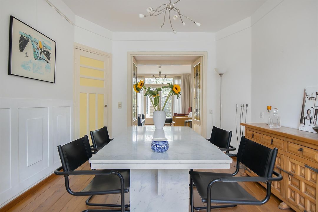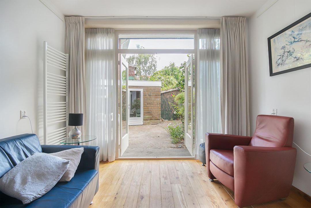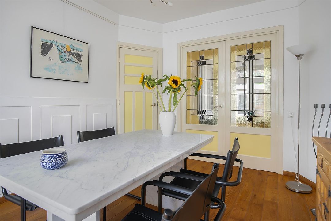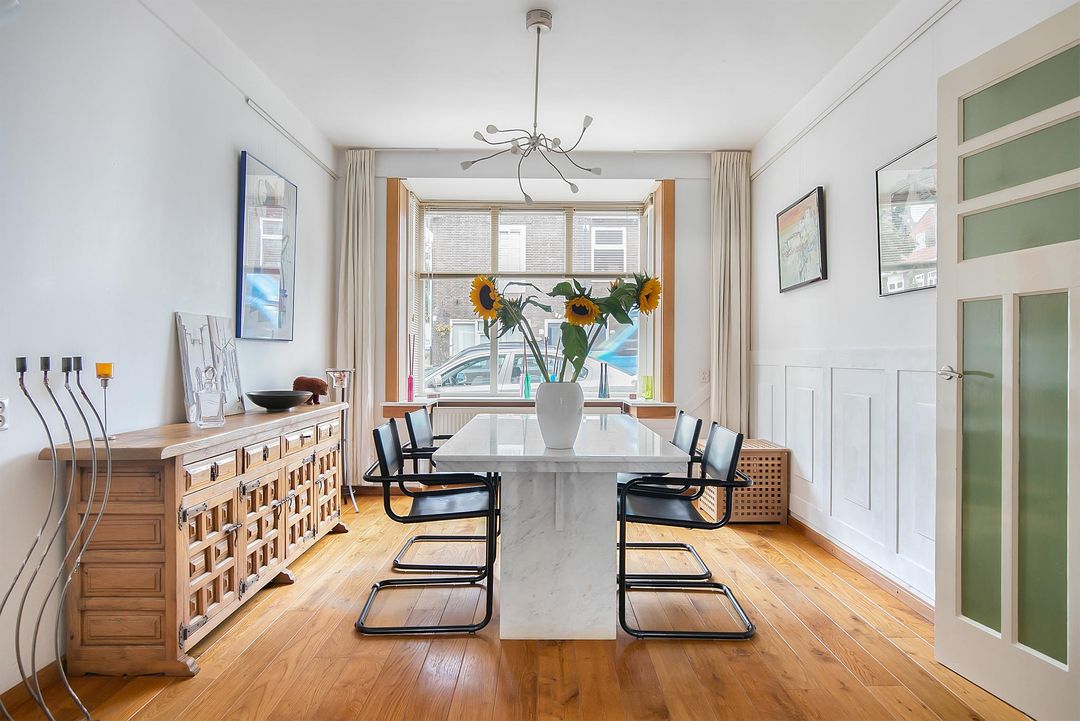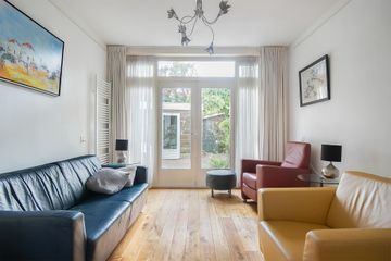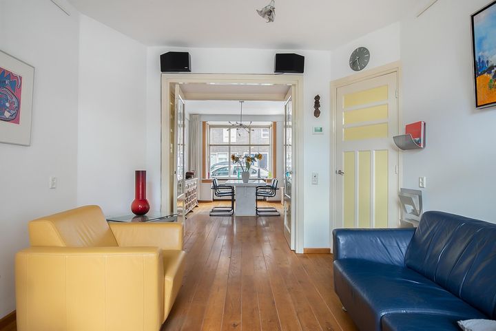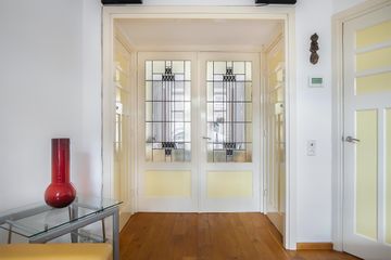 De living is en-suite waardoor u eenvoudig uw eet- en zithoek kunt scheiden of u kunt er 1 open ruimte van maken door de 2 originele en-suite deuren, met fraaie glas-in-lood details, open te zetten. De woonkamer heeft een massief eiken vloer en ook hier zijn zowel de wanden als het plafond afgewerkt met strak wit schilderwerk. Aan licht heeft u absoluut geen gebrek in deze ruimte(s)! De woning heeft een karakteristieke erker met grote raampartijen in de voorkamer en ook in de achterkamer heeft u grote raampartijen met 2 openslaande deuren naar de tuin op het zonnige zuiden.
