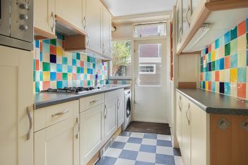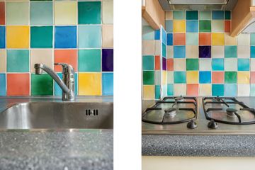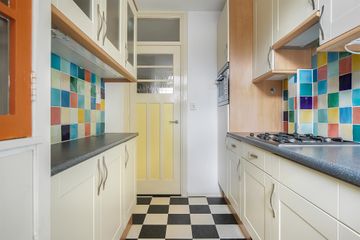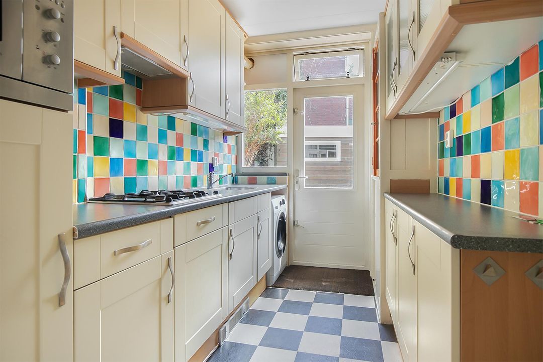 Via de hal heeft u toegang tot de keuken, welke is gesitueerd aan de achterzijde van de woning. De keuken heeft een rechte opstelling aan weerszijde en past helemaal in het karakteristiek van de woning. De betegelde achterwanden met de verschillende kleuren tegels spreken daarin boekdelen. De vele opbergkasten hebben crèmekleurige panelen en bieden naast de riante opbergmogelijkheden, verschillende inbouwapparatuur. Zo zijn er een vaatwasser, een combimagnetron, een afzuigkap, een vriezer en een koelkast aanwezig. Het antracietkleurige werkblad heeft een 4-pits gasfornuis, een rvs-spoelbak en onder het werkblad is er ruimte gecreëerd voor uw wasmachine. Via de keuken heeft u tevens toegang tot de achtertuin.