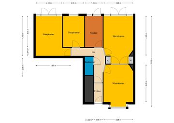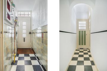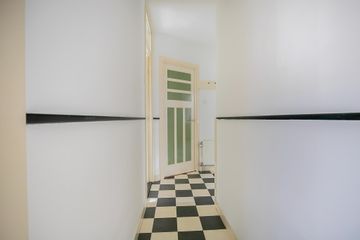 Via de voordeur betreedt u de ontvangsthal met toegang alle vertrekken: de 2 slaapkamers, de keuken, de badkamer met toilet, en de en-suite woonkamer. Waar de wanden en het plafond (met inbouwspots) hier netjes zijn afgewerkt met strak wit schilderwerk, is er op de vloer gekozen voor een zwart/witte vinylvloer die doorgelegd is naar de keuken.