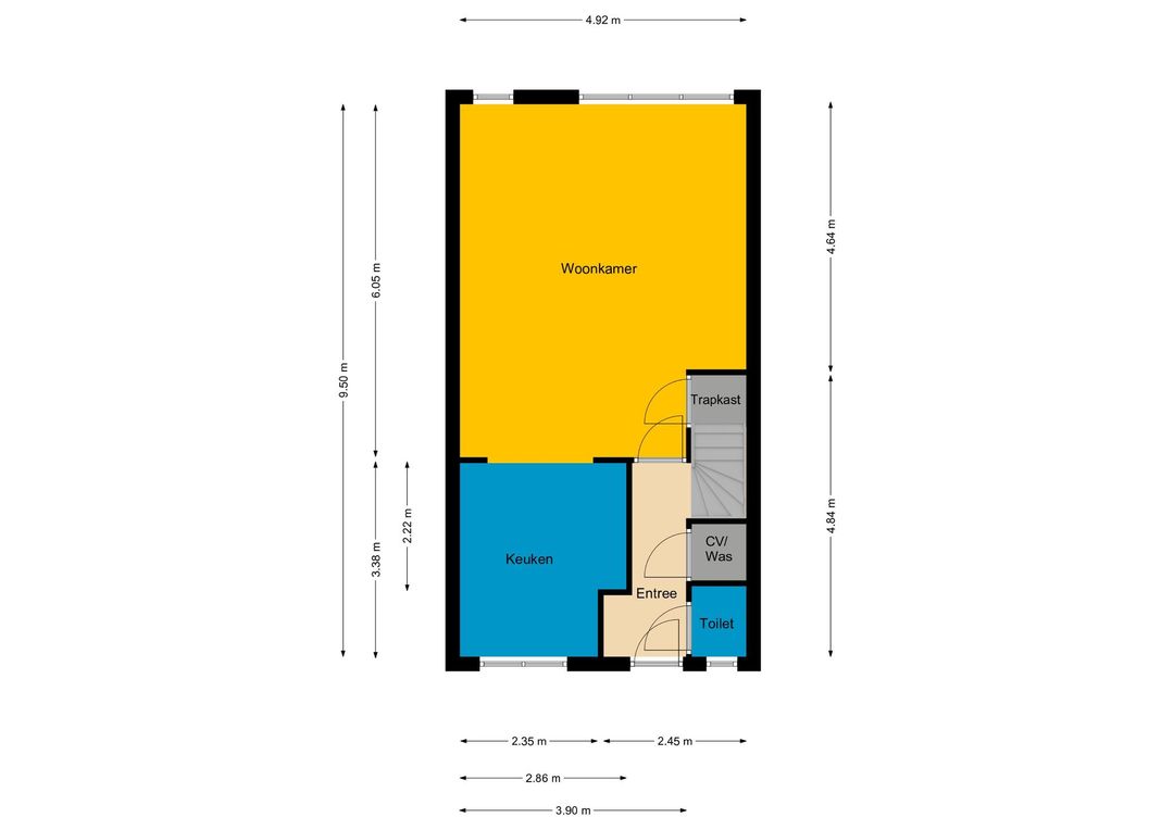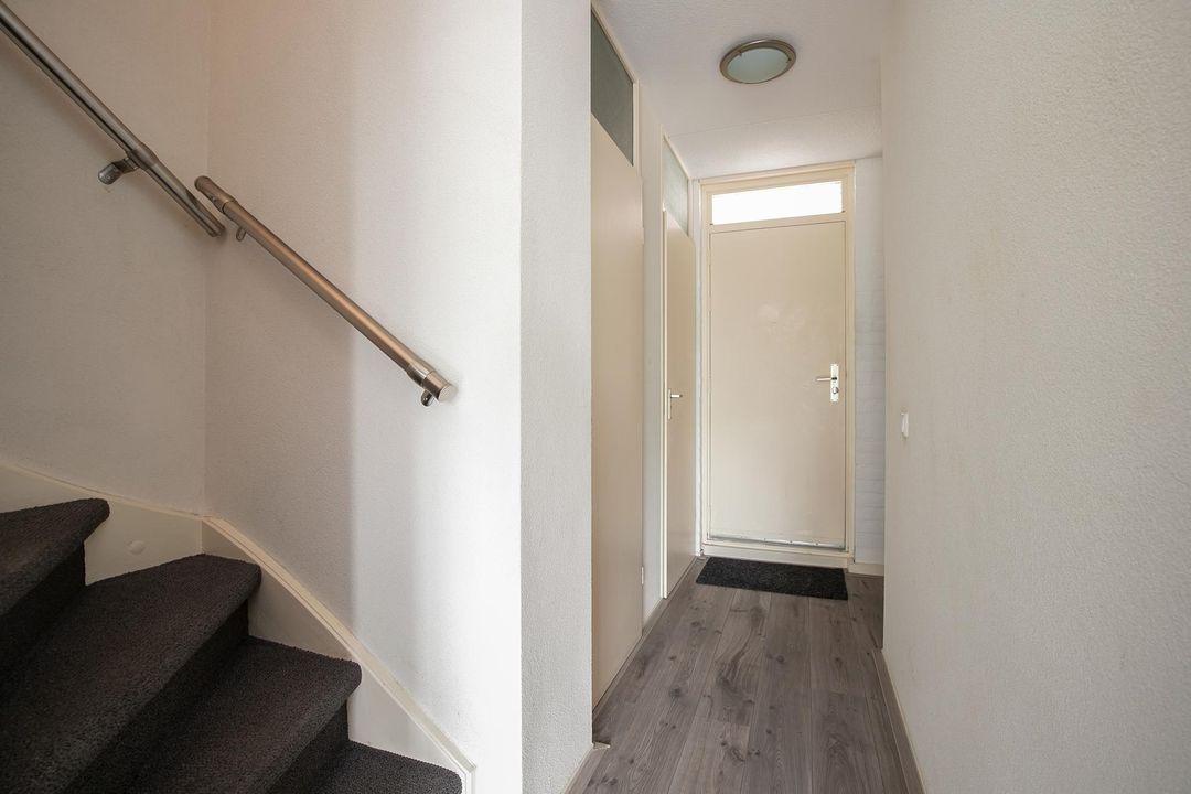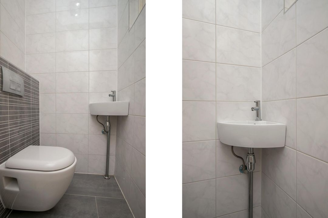 Via de galerij met de brievenbussen betreedt u middels de voordeur de ontvangsthal. Vanuit hier heeft u toegang tot de woonkamer, de CV (Bosch) kast met aansluiting voor de wasmachine, de trap naar de eerste verdieping en het toilet. Vanuit de ontvangsthal is de nette lichtgrijze laminaatvloer geheel doorgelegd over de verdieping, met uitzondering van het toilet. De toiletruimte is volledig betegeld met een gemarmerde tegel aan de wanden, een antracietkleurige vloertegel en antracietkleurige siertegels aan de wand van het hangende toilet. Tevens zijn er een fonteintje en een mechanisch ventilatiesysteem aanwezig.