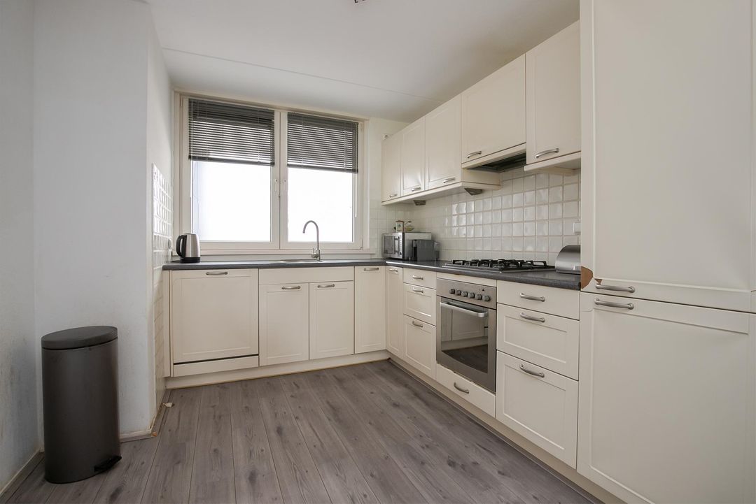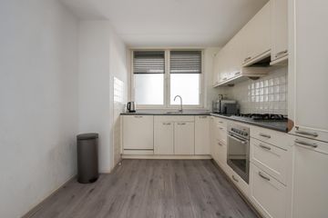 Deze open keuken is het verlengstuk van de woonkamer en is gelegen aan de voorzijde van de maisonnette. Door de twee grote draaikiepramen wordt de keuken perfect belicht! De keuken heeft een ruime L-opstelling, hierdoor heeft u aan werk- en opbergruimte absoluut geen gebrek! Het grijze kunststofwerkblad heeft een rvs-spoelbak en een 4-pitsgasfornuis.