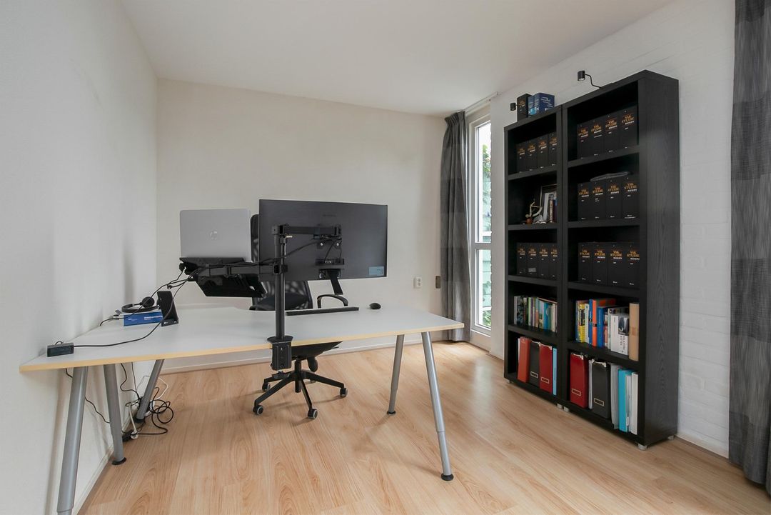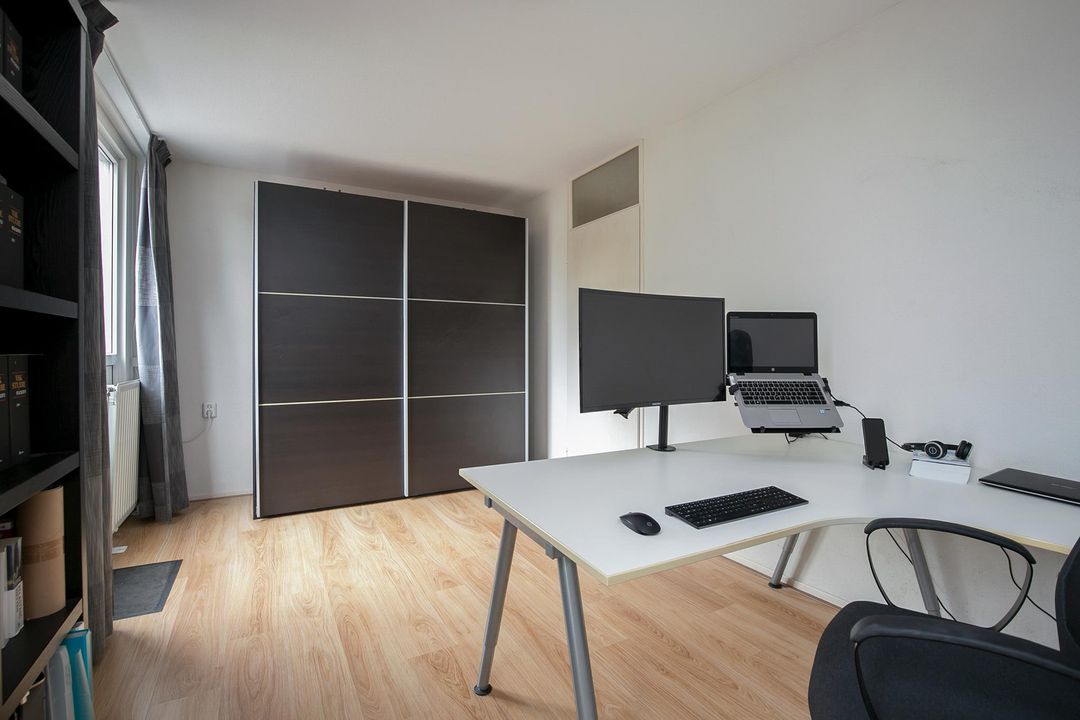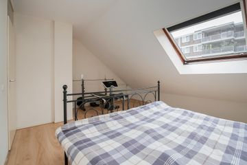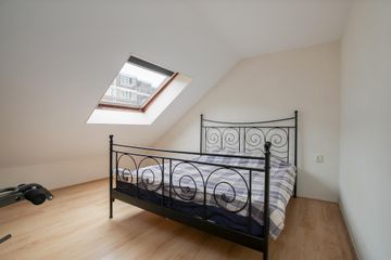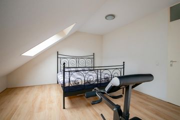 De eerste slaapkamer heeft een witte wandafwerking op zowel de wanden als aan het plafond. De kamer wordt goed belicht door de grote raampartijen en de loopdeur naar het terras. Het terras is 9m2 groot en gelegen op het zonnige zuiden en is voorzien van een elektrische zonnewering. Daarnaast heeft u een prachtig vrij uitzicht over de groene omgeving van het park, aangrenzend aan het complex. De tweede slaapkamer heeft een half schuin dak met een riant dakraam. De kamer heeft een witte afwerking op het plafond en aan de wanden.