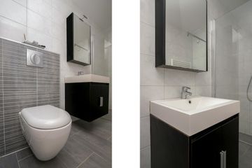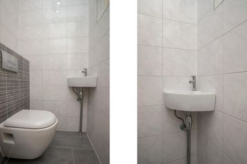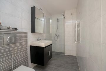 De badkamer heeft een moderne uitstraling en is volledig betegeld. De afwerking is hier identiek aan de toiletruimte op de begane grond. Daarnaast is de ruimte voorzien van een hangend toilet, een wastafel met designmeubel, een ruime inloopdouche met handdouche, een designradiator en is de ventilatie te regelen middels het mechanische ventilatiesysteem.
