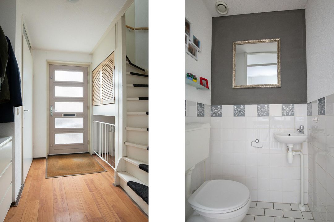 De toiletruimte is half betegeld met een witte vloertegel en witte wandtegels. Daarnaast is er aan de wand gekozen voor een sierlijst als afscheiding tussen de wit geschilderde wanden in combinatie met een grijze achterwand. De ruimte heeft een staand toilet, een fonteintje en een mechanisch ventilatiesysteem.