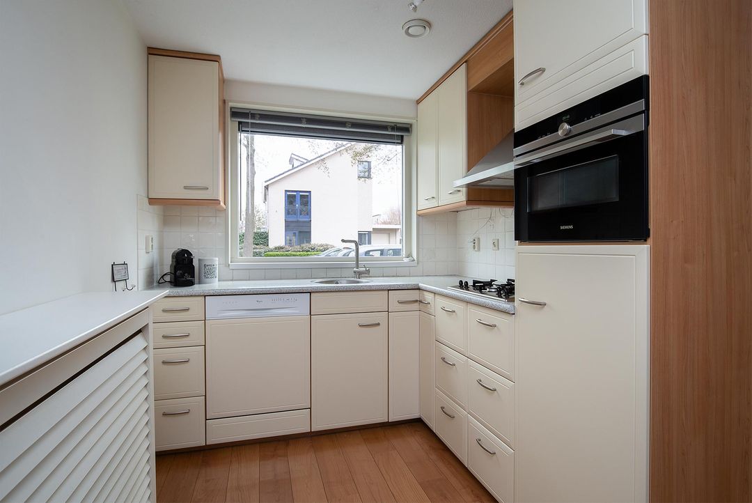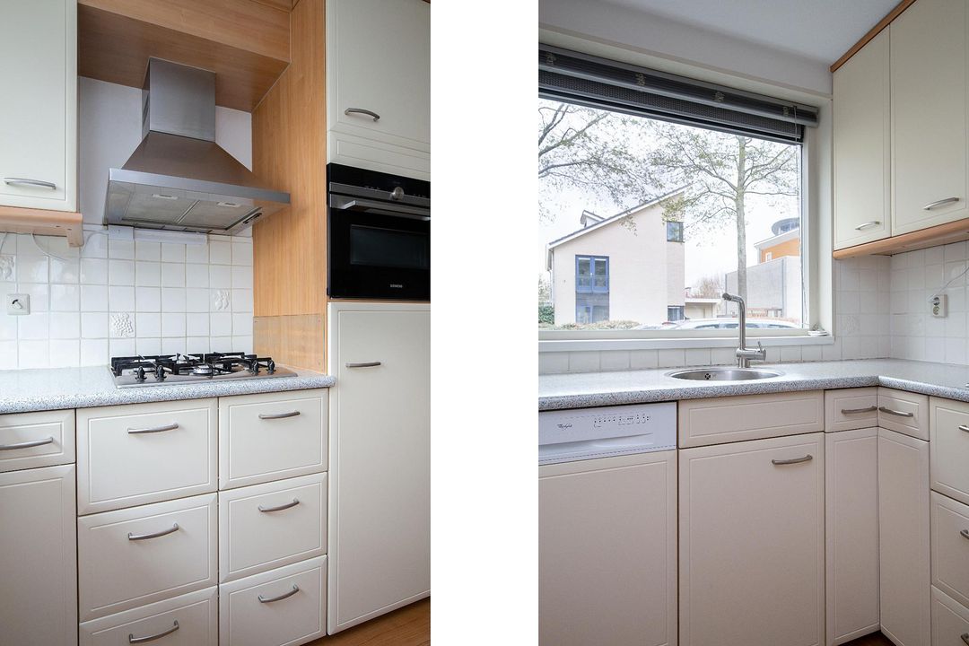 Deze open keuken heeft een L-opstelling en is afgewerkt met crèmekleurige panelen, een kunststof werkblad en wit betegelde achterwand. De RVS spoelbak en het 4-pits gasfornuis zijn netjes weggewerkt in het werkblad. Daarnaast heeft de keuken een groot raampartij, dit geeft naast een prettige lichtinval ook een leuk zicht in de wijk tijdens het koken! De keuken is voorzien van diverse inbouwapparatuur zoals: de vaatwasser, koelkast en de combioven. De RVS afzuigkap hangt netjes tussen de opbergkasten boven het gasfornuis.