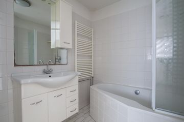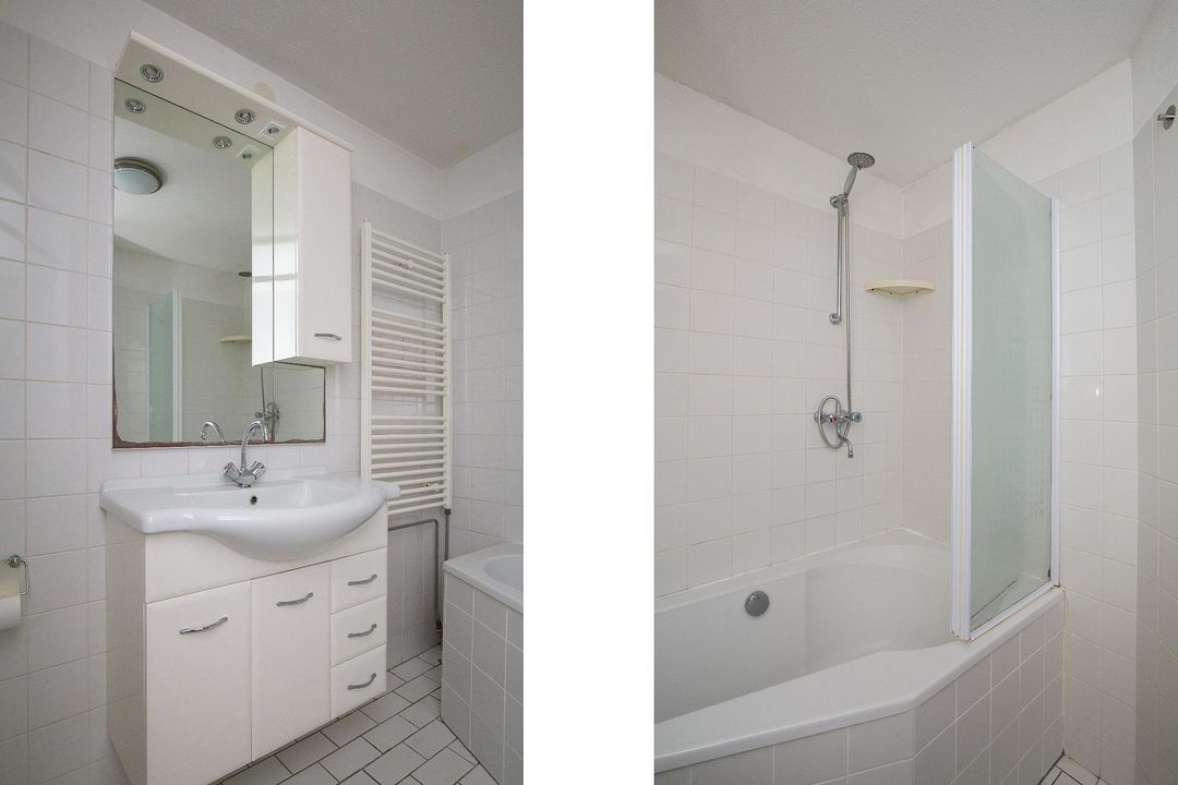 De badkamer is vrijwel geheel betegeld met zowel een witte vloer- als wandtegel. De ruimte is voorzien van een riant ligbad met douche, een staand toilet een wastafel met meubel, een designradiator en een mechanisch ventilatiesysteem.