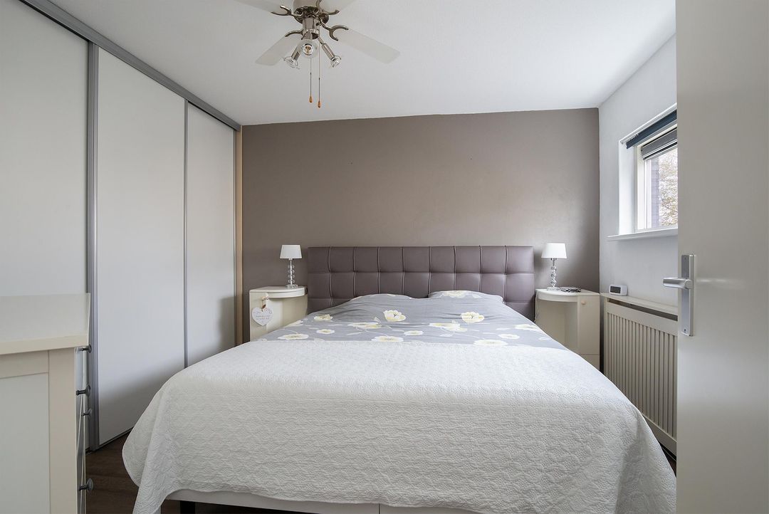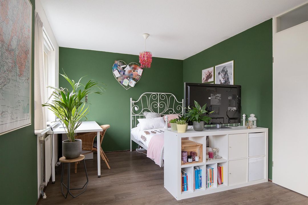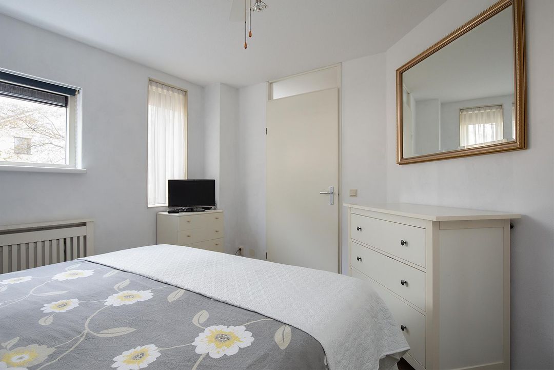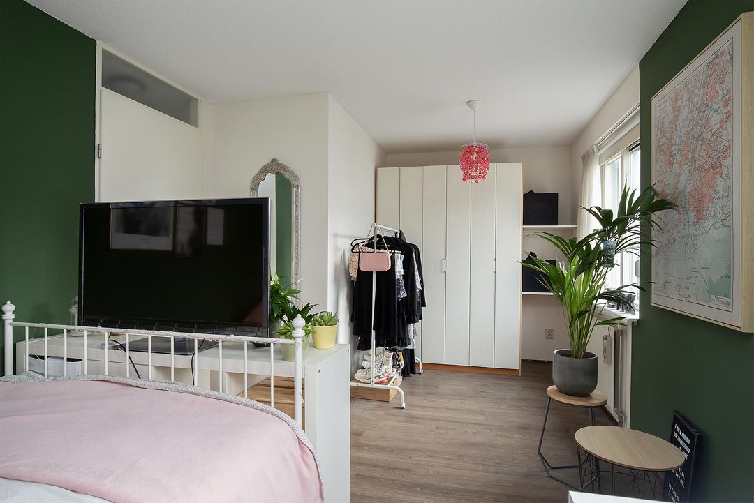 Slaapkamer 1 heeft twee openslaande ramen voorzien van handmatig te bedienen rolluiken. Op de wanden is er gekozen voor strak groen schilderwerk in combinatie met een aantal witte wanden. De tweede slaapkamer heeft eveneens een openslaand raam en een ruime inbouwkast met schuifdeuren. Deze kamer is afgewerkt met wit op aan de wanden.