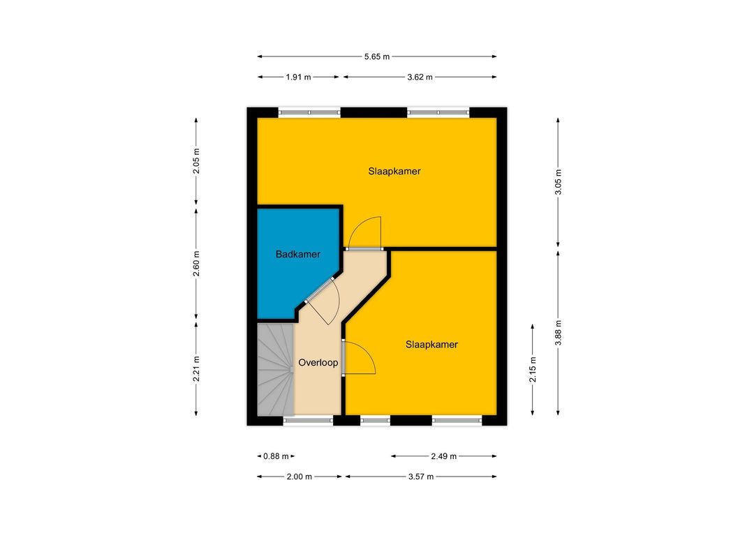 Middels de vaste trap op de begane grond betreedt u de overloop op de eerste verdieping. Vanuit hier heeft u toegang tot de 2 slaapkamers, de badkamer en de vaste trap naar de 2e verdieping. De bruingrijze laminaatvloer is geheel doorgetrokken over de verdieping m.u.v. de badkamer. Daarnaast zijn de wanden en het plafond afgewerkt met wit schilderwerk.