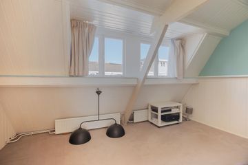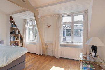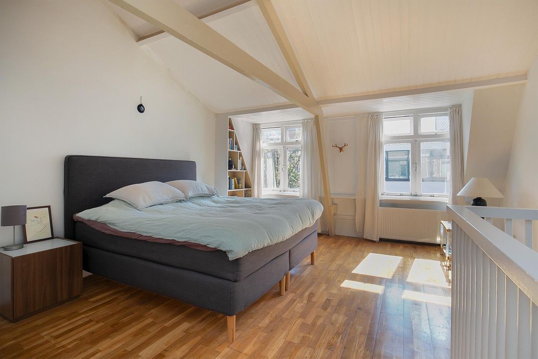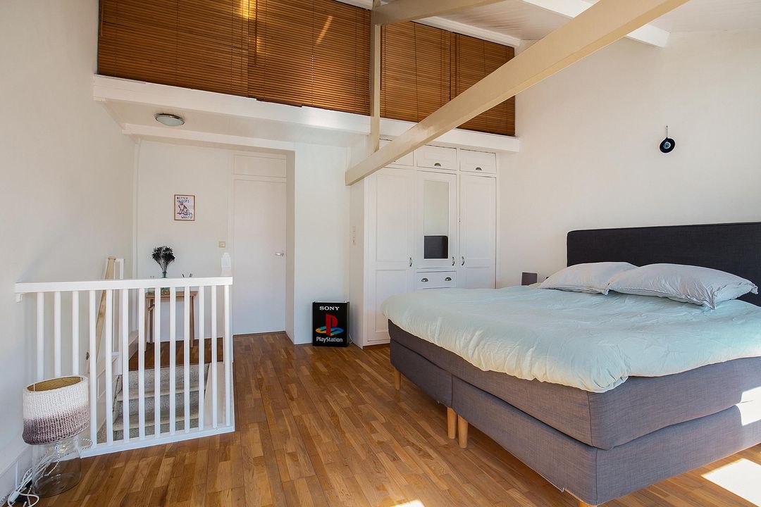 Met de trap vanuit de hal komt u direct op de open masterbedroom van de verdieping. Deze kamer is met recht ‘prachtig’ te noemen, dit door het formaat van de kamer, het licht wat er binnen komt door de twee dubbele ramen en natuurlijk door de hoogte! Deze kamer heeft daarnaast twee opbergmogelijkheden: er is een vaste kast en daarnaast is er een vide voor bergruimte. Deze vide heeft een dakraam.