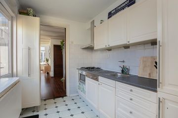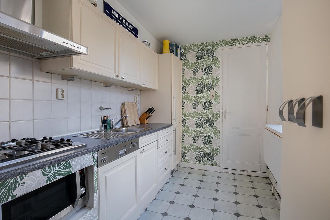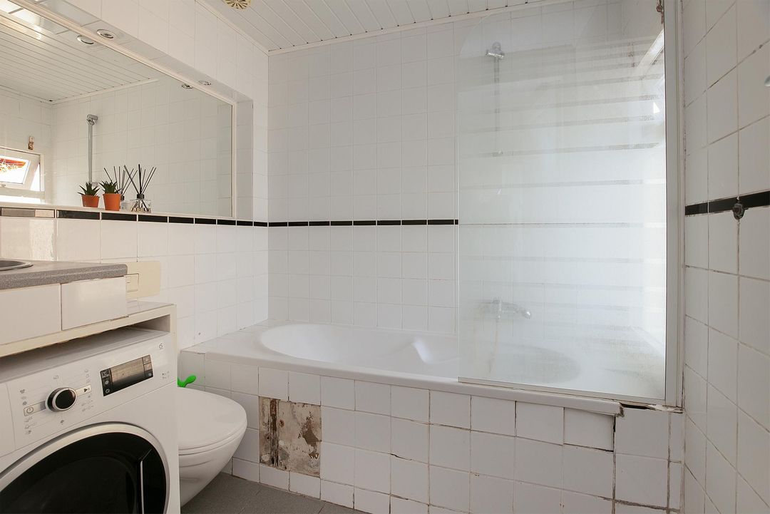 De keuken heeft een doorgang middels een schuifdeur en heeft een rechte opstelling. De keuken dient wellicht vervangen te worden maar heeft momenteel een vaatwasser, koelkast, diepvries, 4-pits fornuis en een rvs afzuigkap. In de keuken, is net als de woonkamer veel lichtinval, dit door het grote raam en de tuindeur(met glas). Aansluitend aan de keuken is de badkamer. De badkamer heeft een zwevend toilet, een ligbad met douche, wastafel en er is de aansluiting voor de wasmachine. De badkamer heeft een lichte wandtegel en een grijze vloertegel. Het aanwezige raam zorgt voor zowel ventilatie als licht. Net als de keuken kunt u de badkamer ook geheel naar eigen smaak opknappen.