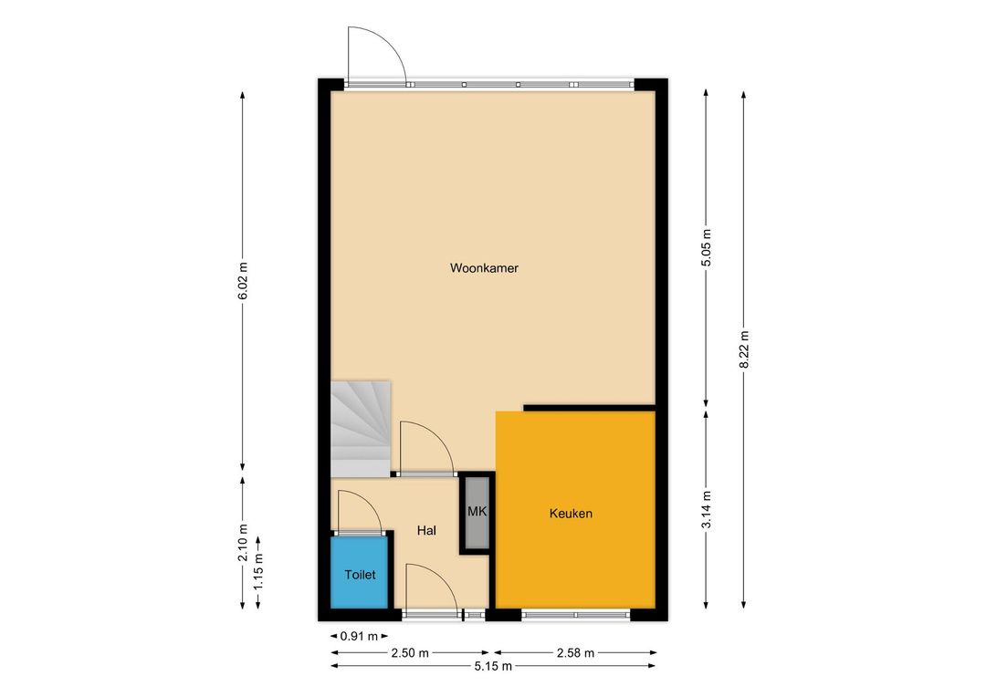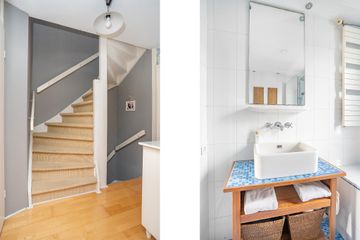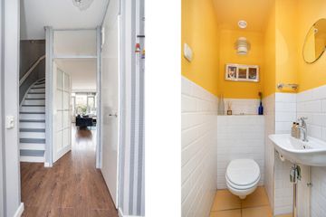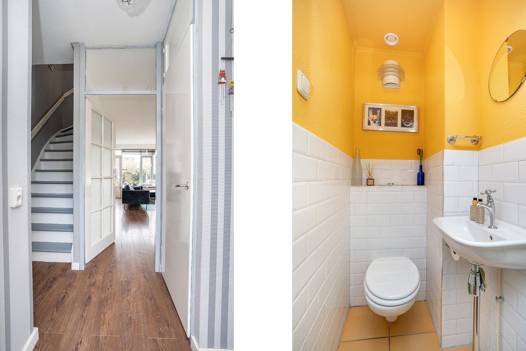 Middels de voortuin betreedt u via de hal de woning met toegang tot het toilet, de meterkast, woonkamer met halfopen keuken en de trap naar de eerste verdieping. Het toilet heeft een zwevend wit toilet, wit fonteintje en de wanden zijn half betegeld.