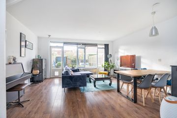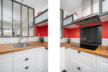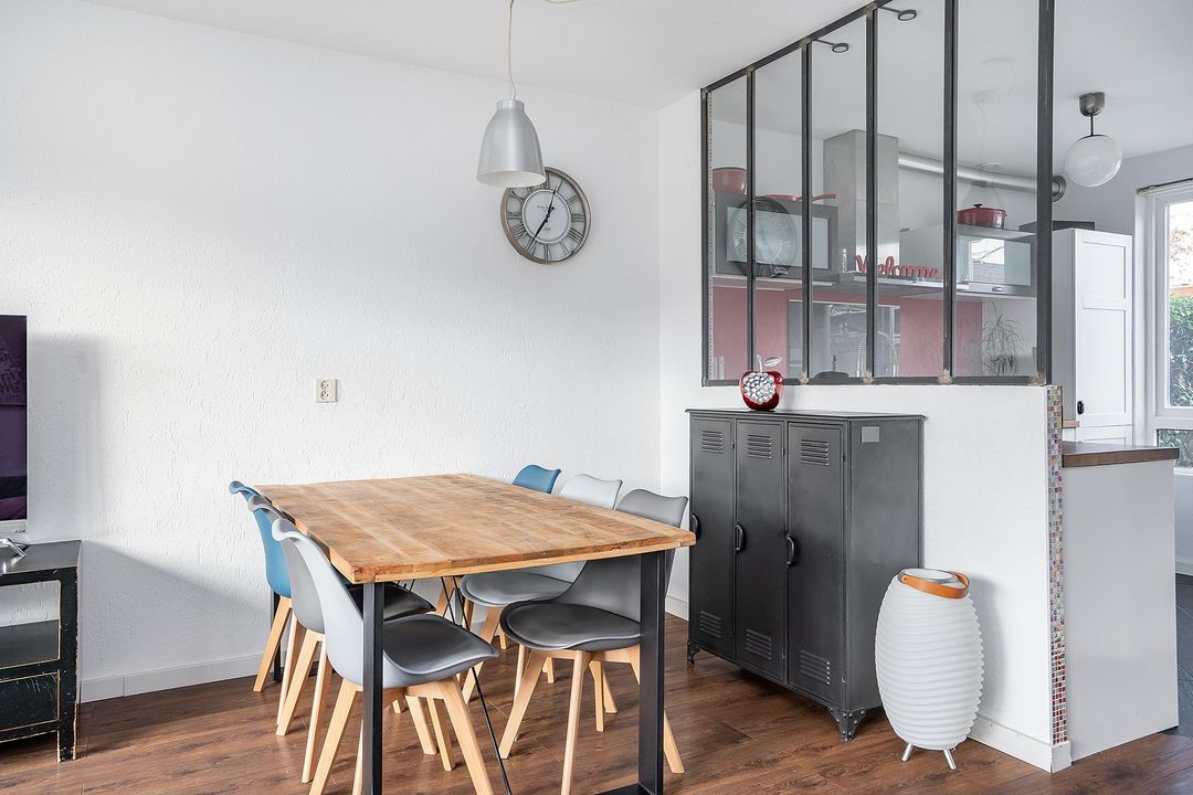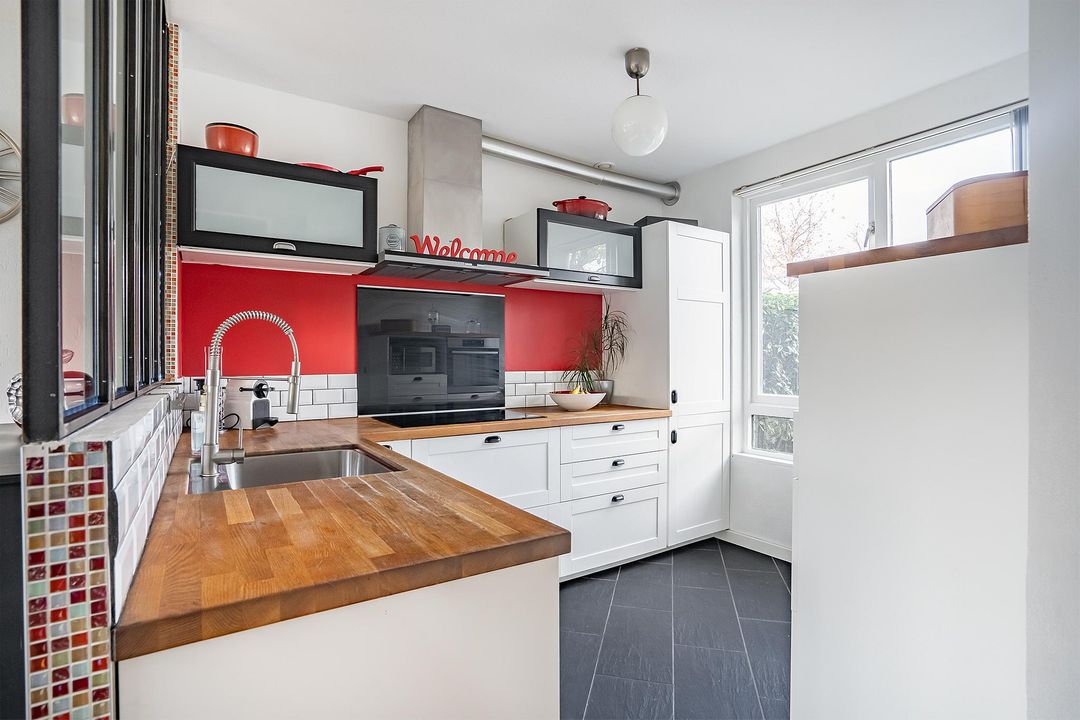 De keuken heeft een L-opstelling met een extra gedeelte. De keuken heeft witte panelen met zwarte grepen, een houten aanrechtblad en heeft een bijpassende spatrand. dDe keuken is voorzien van de volgende inbouwapparatuur: inductiekookplaat, koelkast, diepvries, vaatwasser en een oven. De woonkamer en keuken worden gescheiden door een industriële stalen delen met glas, hierdoor lijkt het op 1 ruimte en is er veel licht in de keuken!