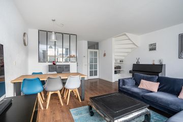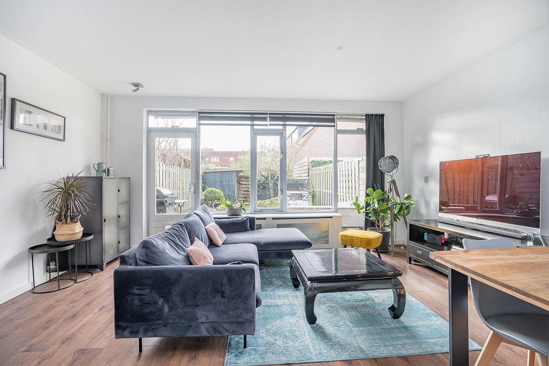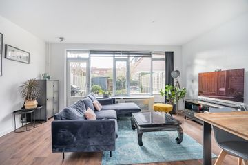 De woonkamer geeft u een enorm mooie en lichte beleving door de enorme raampartijen met uitzicht op de zonnige achtertuin. Vanuit de hal is er een bruine laminaatvloer doorgelegd naar de woonkamer, de keuken heeft een donkere tegelvloer. De wanden hebben een lichte wandafwerking, het plafond heeft eveneens een lichte en strakke afwerking.