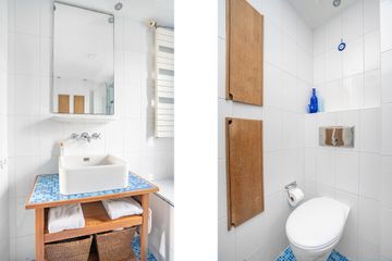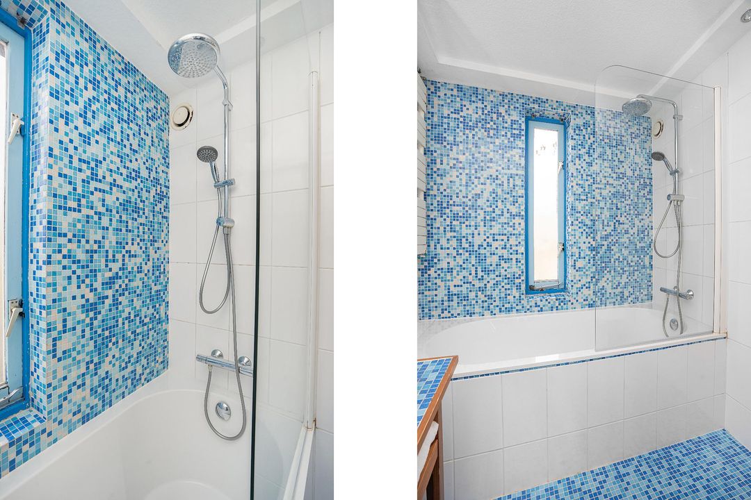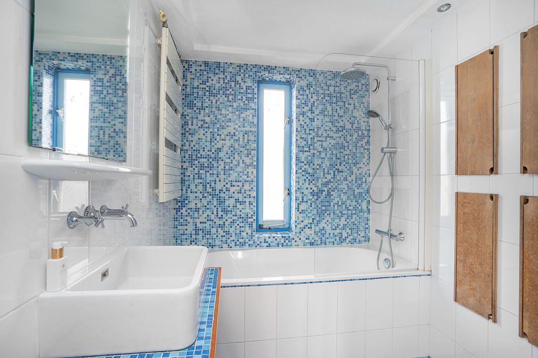 De badkamer heeft een wit zwevend toilet, een ligbad met douche, badkamermeubel met wastafel, designradiator en zowel een openslaand raam als mechanische ventilatie. De wanden en vloer hebben een combinatie van een witte tegel met een blauwe mozaïektegel.