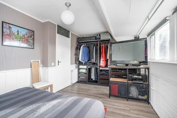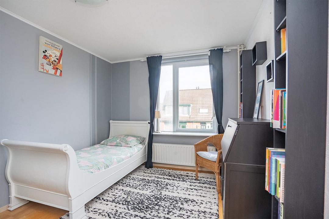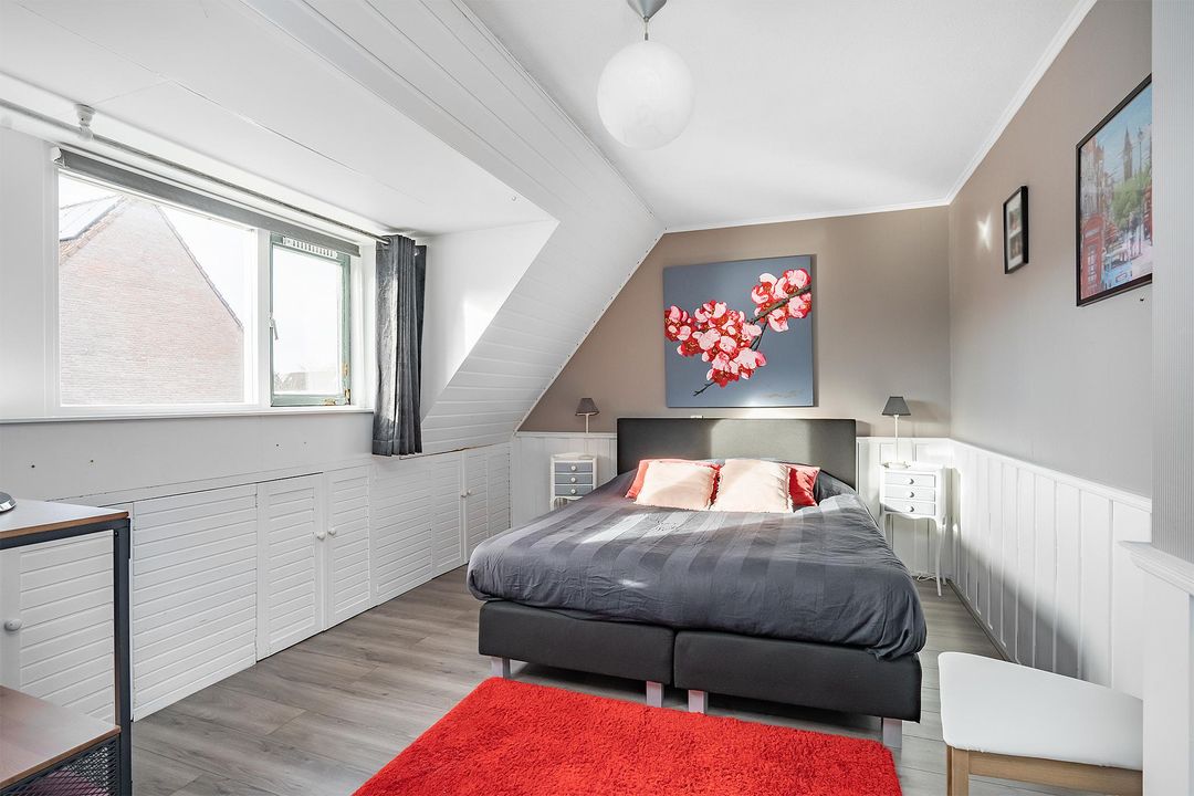 De geschilderde trap komt uit op de overloop met toegang tot 2 ruime slaapkamers, de badkamer en de trap naar de tweede verdieping. De masterbedroom heeft een groot dakkapel met 2 openslaande ramen, een nette laminaatvloer en veel praktische bergruimte in de knieschotten. De tweede slaapkamer is gelegen aan de voorzijde, heeft een parketvloer, strakke wanden, een openslaand raam en een kastenwand over de gehele breedte van de kamer.