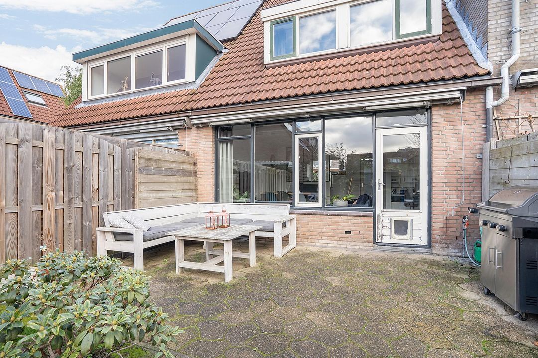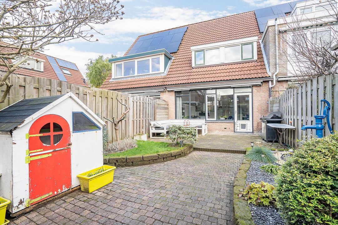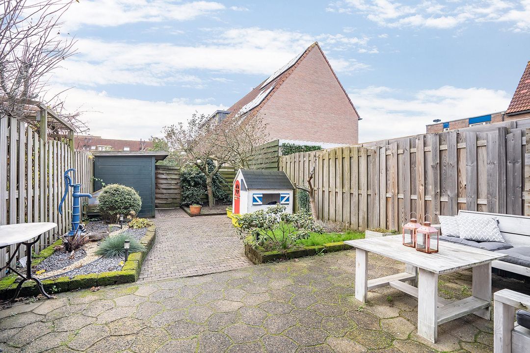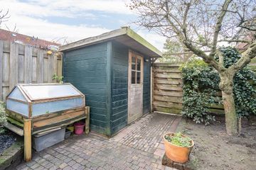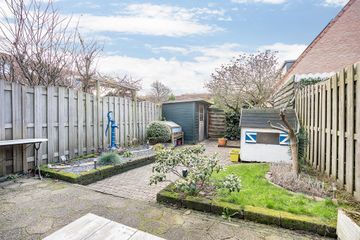Deze zeer zonnige tuin met ligging op het zuidwesten heeft veel groen, zowel hoge als lage beplanting, een houten berging, een kraantje, geheel rondom een houten schutting en een zonnescherm. Heel prettig is dat de tuin een achterom heeft!