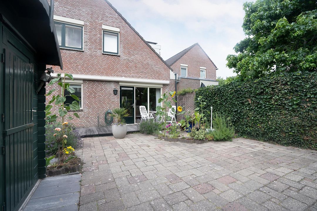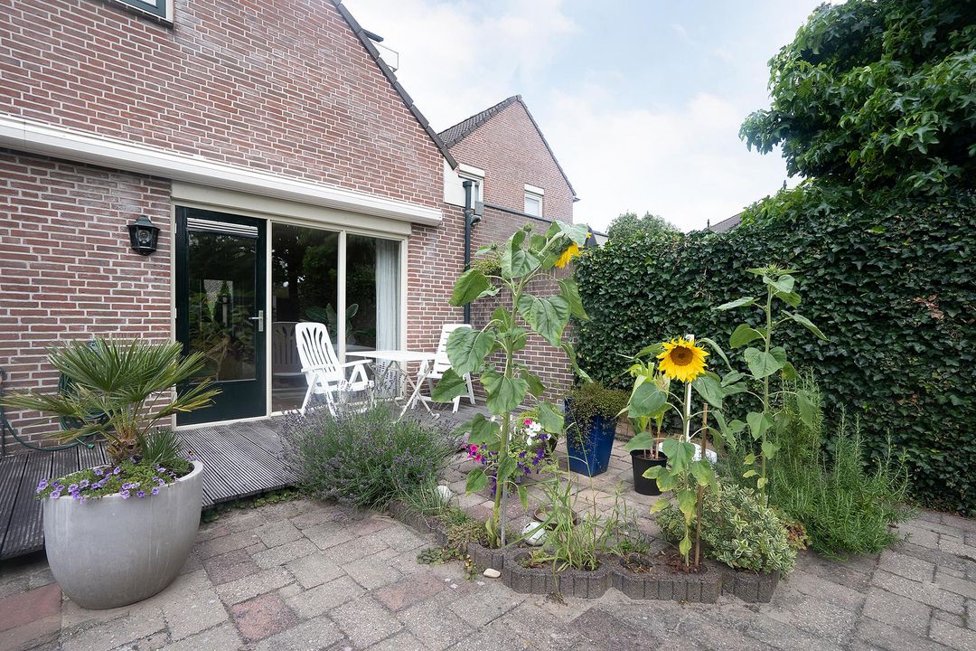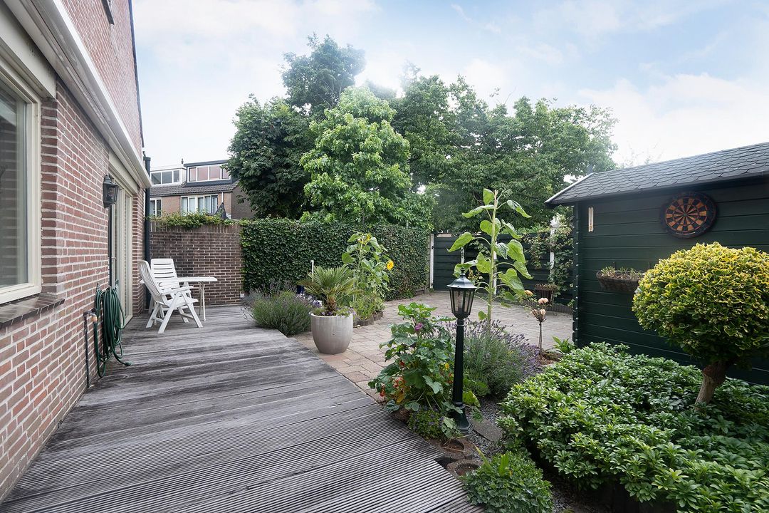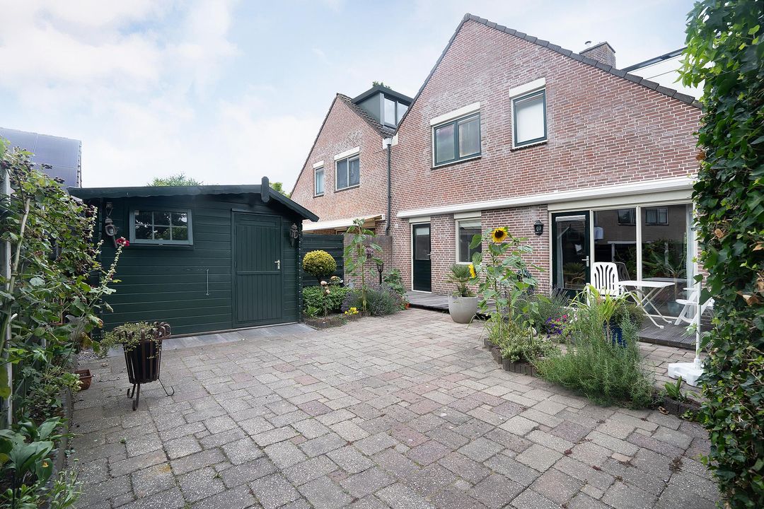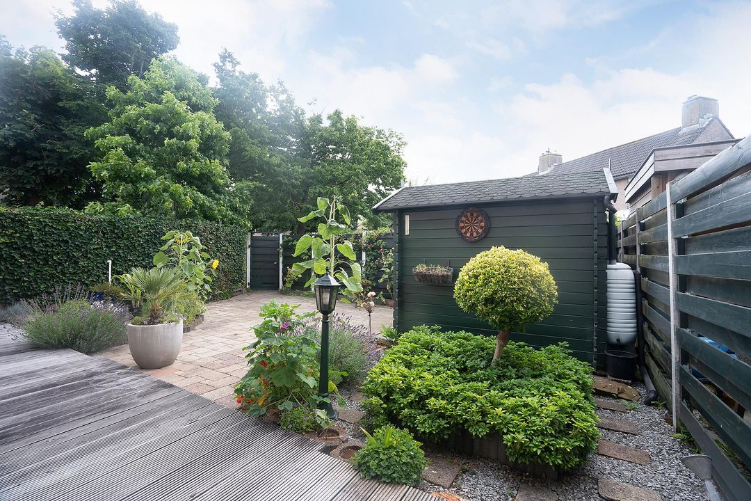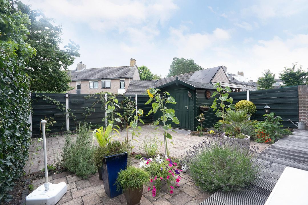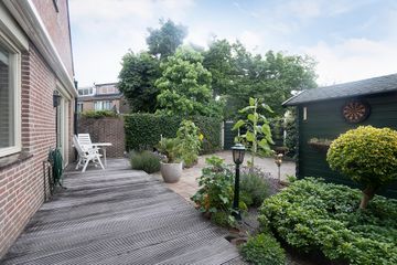 Deze heerlijke achtertuin betreedt u via de woonkamer, de keuken en de achterom. De tuin is maar liefst 78m2 groot en gelegen op het zonnige zuidoosten. Door de gunstige ligging in de wijk kunt hier zeer privé gelegen van het mooie weer genieten! De tuin is goed verzorgd en heeft een houten vlonder/terras tegen de woning aan. Hier kunt een lounge set plaatsen en lekker beschut onder het elektrisch te bedienen zonnescherm zitten. Daarnaast is de tuin grotendeels bestraat en heeft u veel plaats voor groen in de verschillende plantenborders. Extra opbergruimte heeft u in de houten berging (7m2) voorzien van elektra.