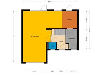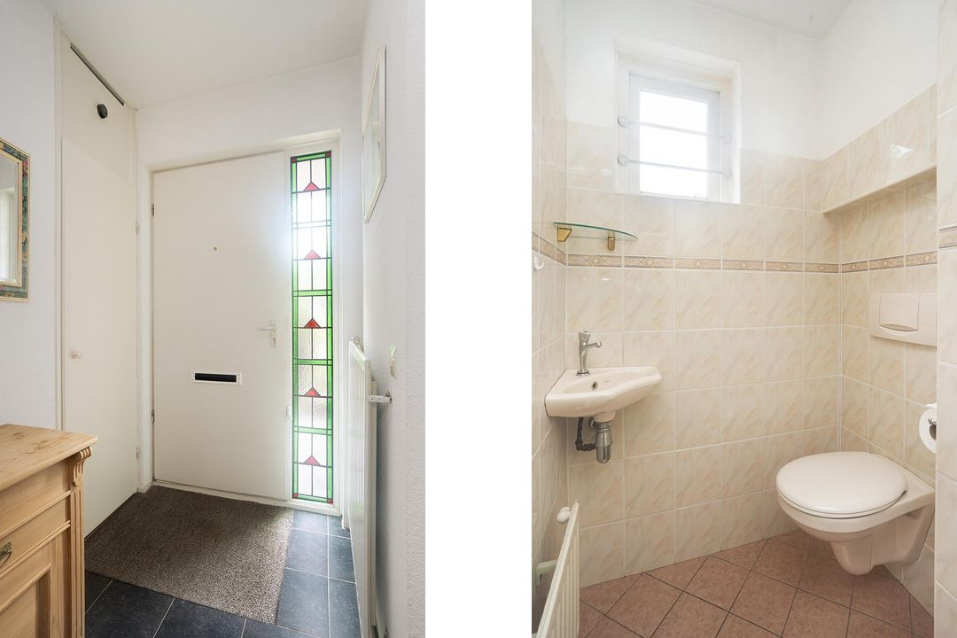 Via de voordeur betreedt u de ontvangsthal met toegang tot de meterkast, het toilet, de trap naar de eerste verdieping en de woonkamer. De ontvangsthal heeft een donkergrijze tegelvloer en zowel aan de wanden als het plafond is er gekozen voor wit schilderwerk.