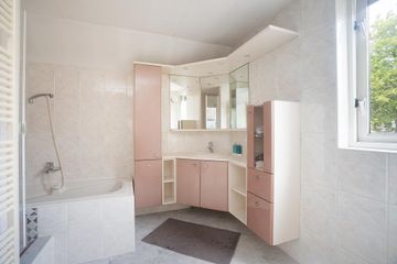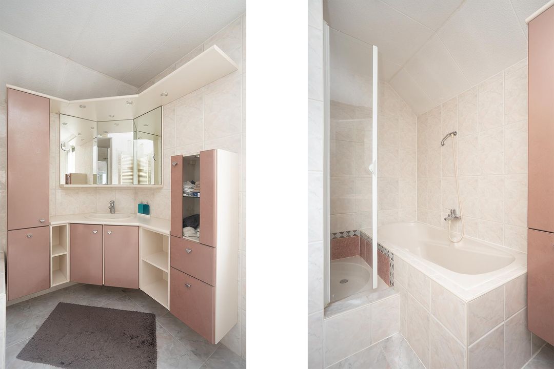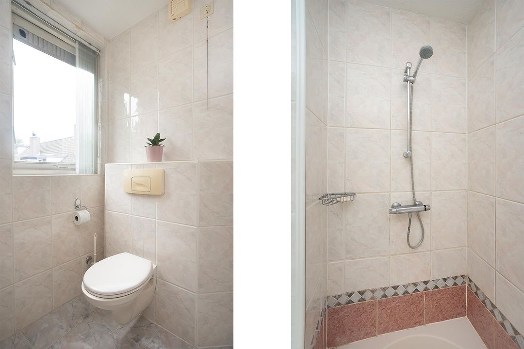 Deze ruimte is vrijwel geheel betegeld met wit gemarmerde vloer- en wandtegels. Er is een heerlijk ligbad aanwezig, een inloopdouche, een designradiator, een toilet en een badkamermeubel met wastafel. U kunt de ruimte snel en eenvoudig ventileren middels het mechanische ventilatiesysteem en via het openslaande raam die de ruimte tevens van daglicht voorziet.