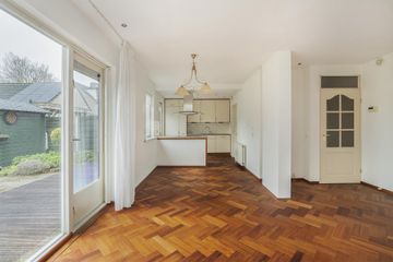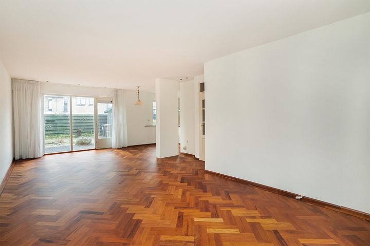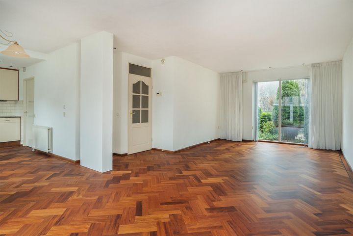 De woonkamer is praktisch ingedeeld: een zitgedeelte aan de voorzijde van de woning en een eetgedeelte met openkeuken aan de zeer brede achterzijde van de woning. Aan weerszijde heeft u grote raampaartijen waardoor de woonkamer bijzonder prettig wordt belicht. Daarnaast heeft u via de 2 loopdeuren toegang tot de achtertuin. De living heeft een prachtige eikenhouten ‘visgraat’ parketvloer die in 2023 opnieuw is geschuurd en in de lak gezet. Daarnaast zijn ook de wanden recent afwerkt met strak wit schilderwerk en heeft het plafond verschillende inbouwspots.