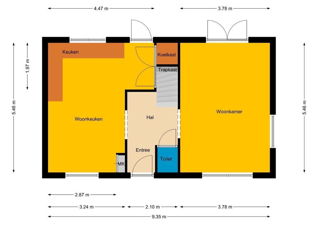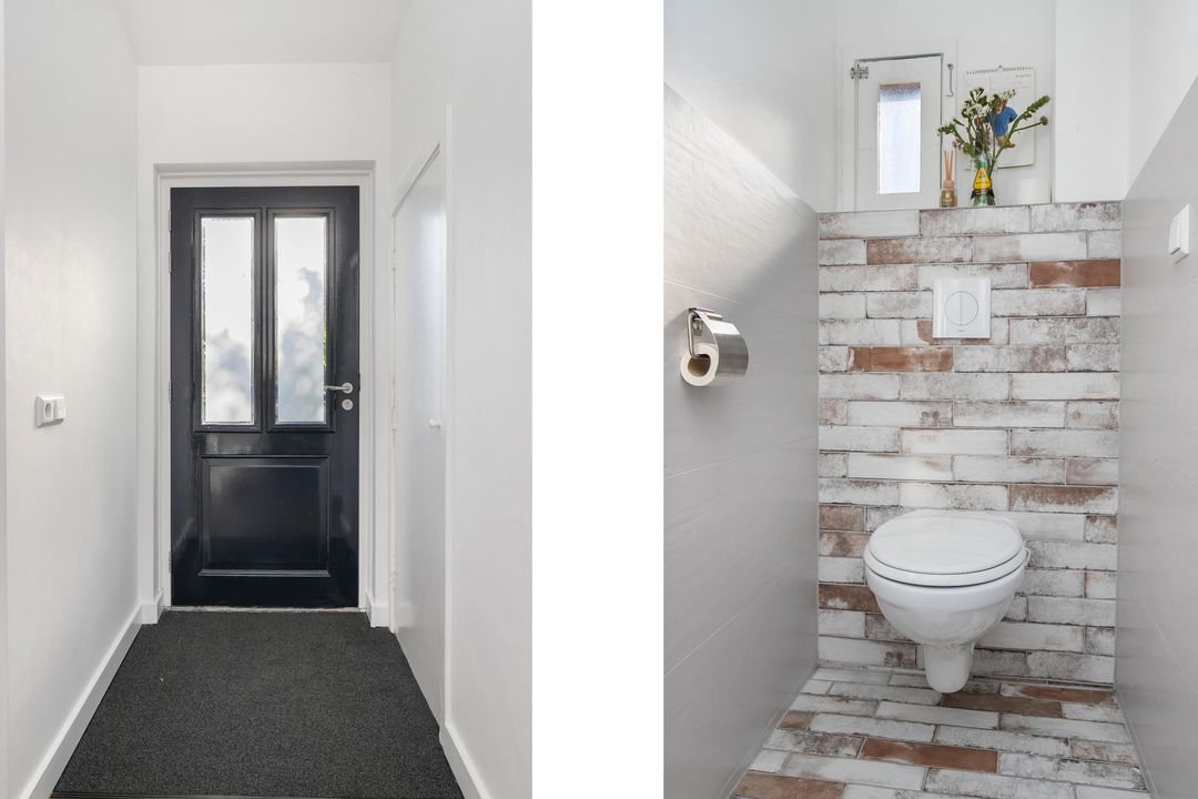 Via de voordeur betreedt u de ruime ontvangsthal met toegang tot het toilet, de trap naar de eerste verdieping, de woonkamer en de woonkeuken. De begane grond heeft een volledig doorgelegde laminaatvloer met vloerverwarming m.u.v. de toiletruimte. In het toilet is er gekozen voor een combinatie van siertegels met een lichte afwerking.