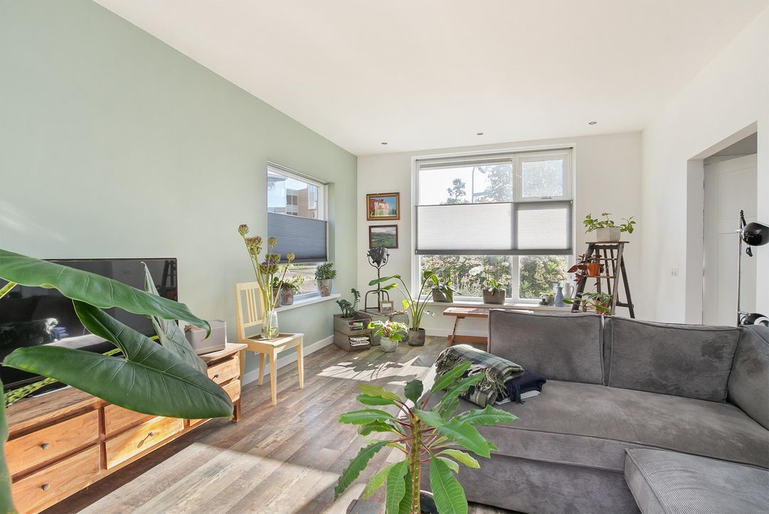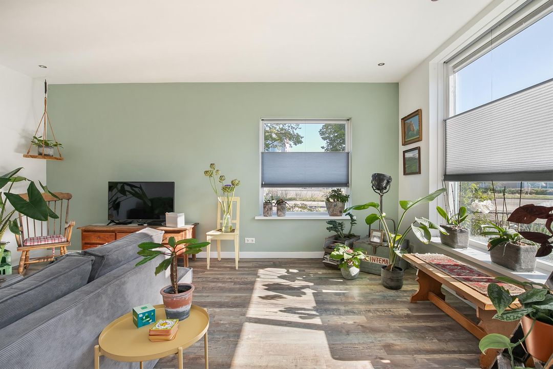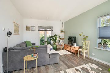Middels de vrije doorloop in de ontvangsthal betreedt u de ruim opgezette living die zeer goed wordt belicht door de grote raampartijen rondom de woning. Daarnaast zijn er 2 openslaande deuren naar de achtertuin aanwezig, die nog eens voor extra lichtinval zorgen. De wanden zijn afgewerkt met strak stucwerk in een combinatie van wit en lichtgroen schilderwerk. Ook het plafond is strak gestuct en heeft naast een wit geschilderde afwerking verschillende inbouwspots.