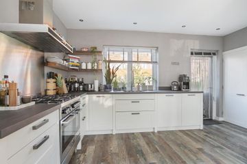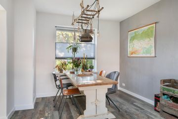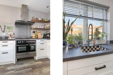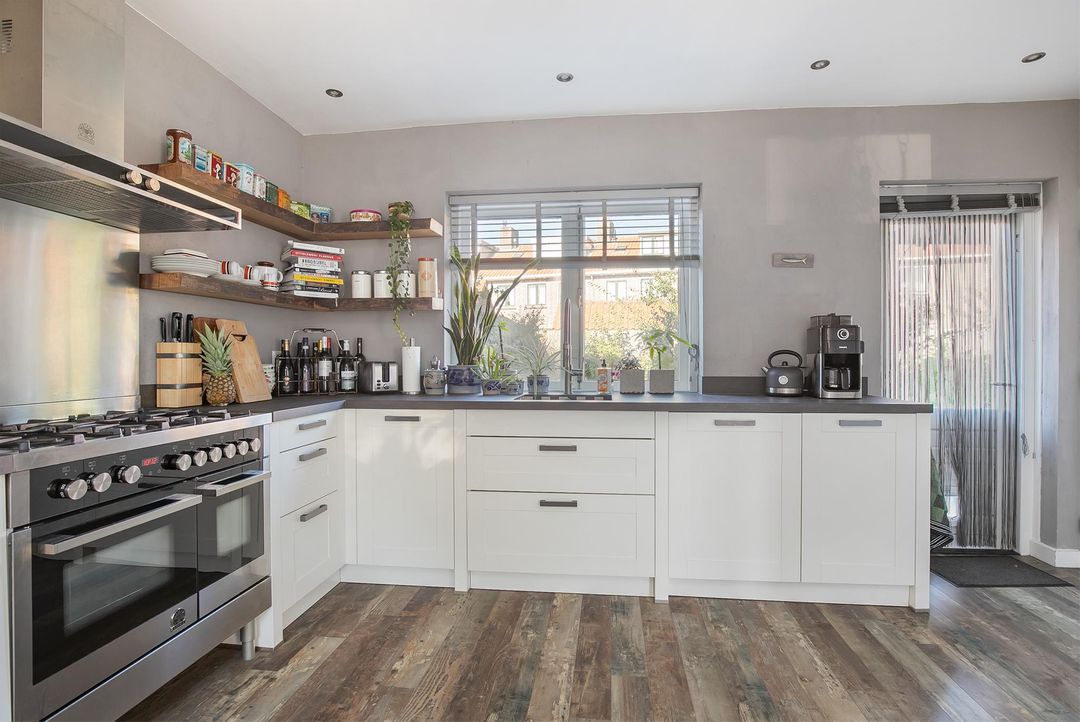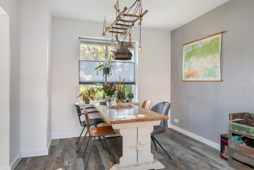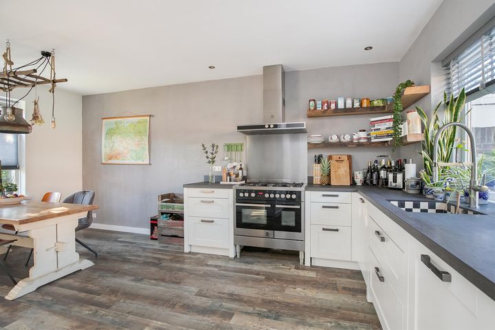 Koken en tafelen in dezelfde ruimte? Dat kan in deze prachtig ruime woonkeuken gesitueerd aan de zijkant van de woning! De woonkeuken heeft een royale L-opstelling waardoor u aan werk- en opbergruimte geen gebrek heeft! Het donkergrijze keramische werkblad heeft een sierlijke spoelbak en heeft tussen de kastenopstelling zowel een dubbele oven met 6-pits gasfornuis als een vaatwasser. Naast de praktische trapkast is er een ingebouwde koel/vriescombinatie. Zowel de wanden als het plafond zijn afgewerkt met strak stukwerk met een combinatie van wit en ‘betoonlook’ schilderwerk aan de wanden en een strak wit plafond met inbouwspots.