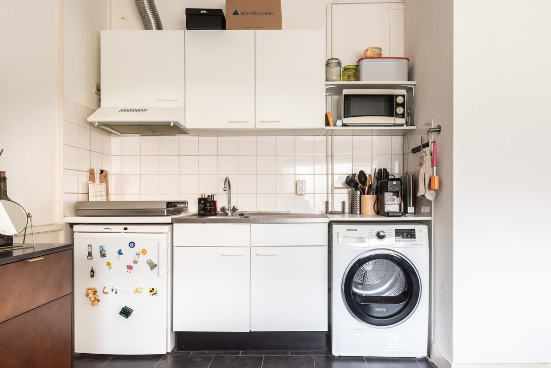 De keuken heeft een rechte opstelling en heeft witte panelen aan de opbergkasten. Boven het raam aan de voorzijde van de woning hangen dezelfde keukenkasten voor extra bergruimte. De keuken heeft een rvs-werkblad met spoelbak, een losse koelkast met vrieslade en een rvs-gaskookplaat met een afzuigkap erboven. Tevens heeft u hier een aansluiting voor uw droger.