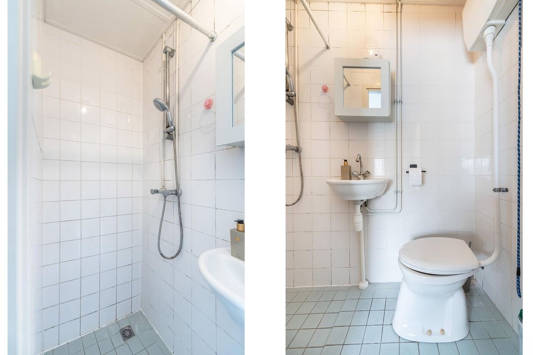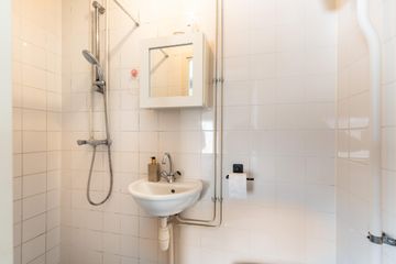 De badkamer is volledig betegeld met een lichtgrijze vloertegel en heeft witte tegels aan de wanden. Er is een handdouche aanwezig, een staand toilet en een wastafel.