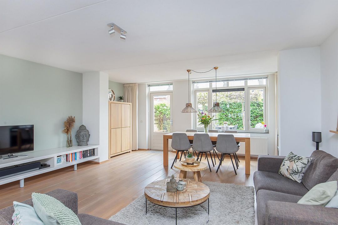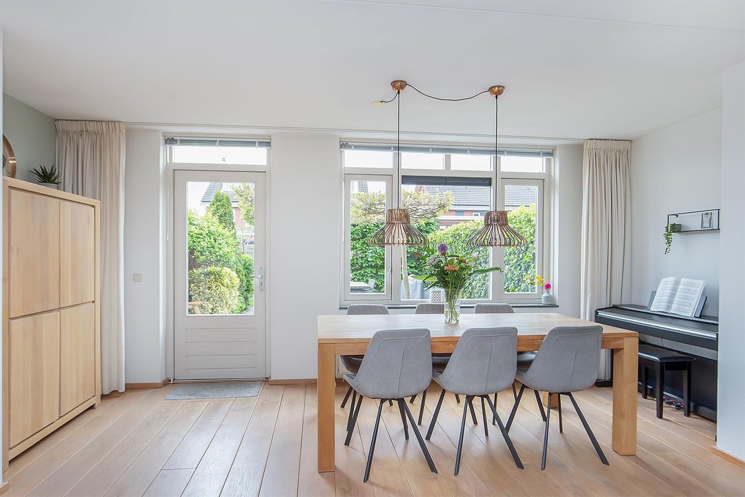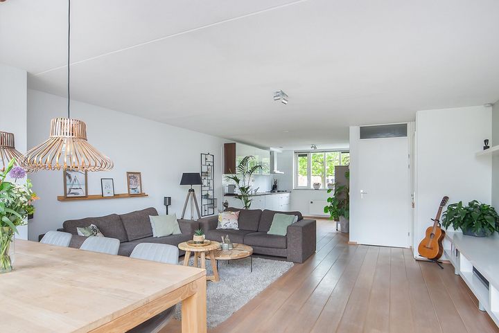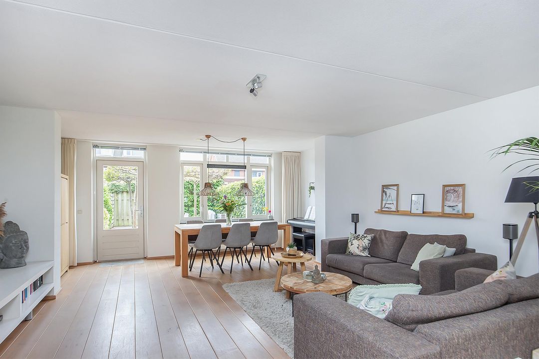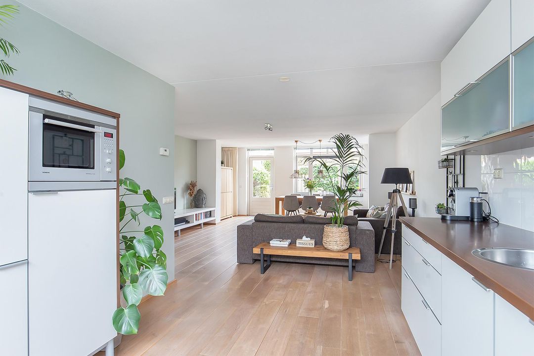De woonkamer is een prettige en lichte leefruimte. De uitbouw over de volle breedte maakt het dat er meer dan voldoende leefruimte is. Zo heb je ruimte voor een leuk zitgedeelte en ook nog eens een apart eetgedeelte. De brede raampartij en de loopdeur zorgen voor een prettige lichtinval in deze ruimte. De aanwezige trapkast is ideaal voor extra bergruimte!