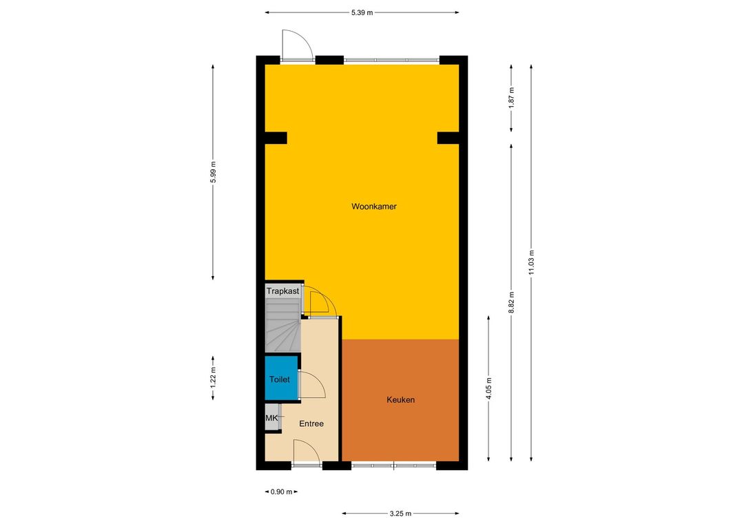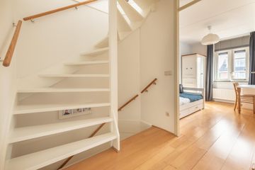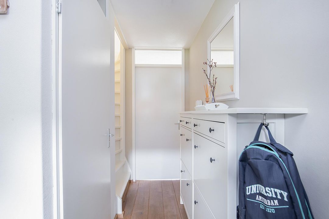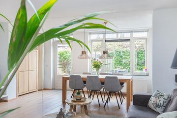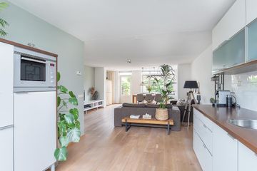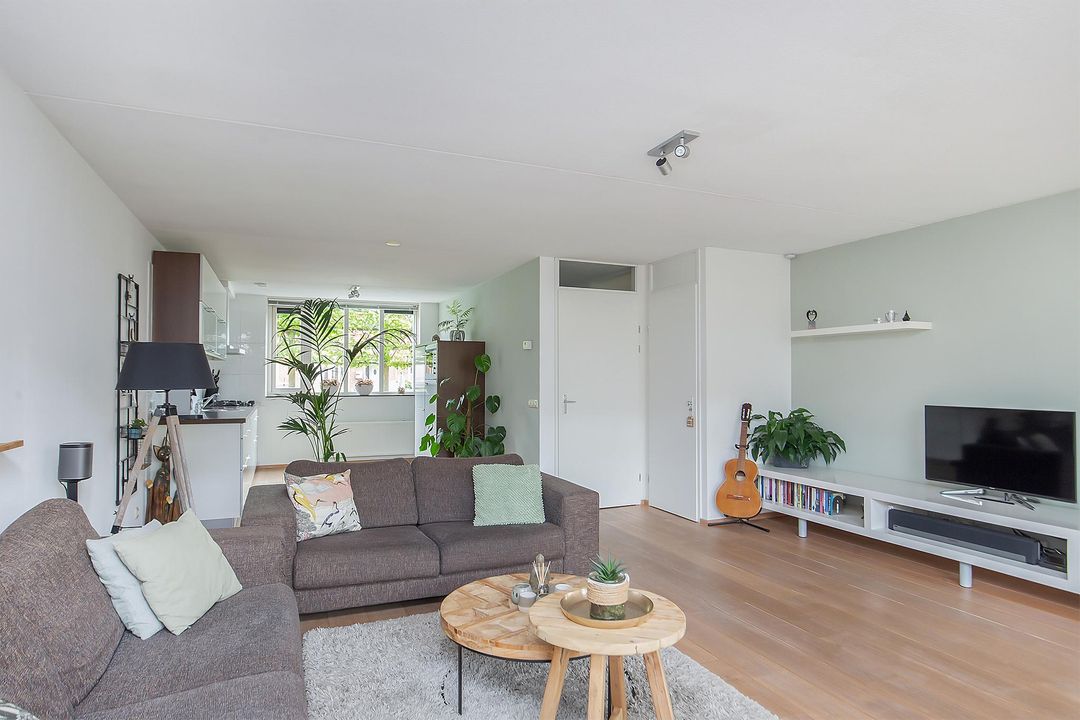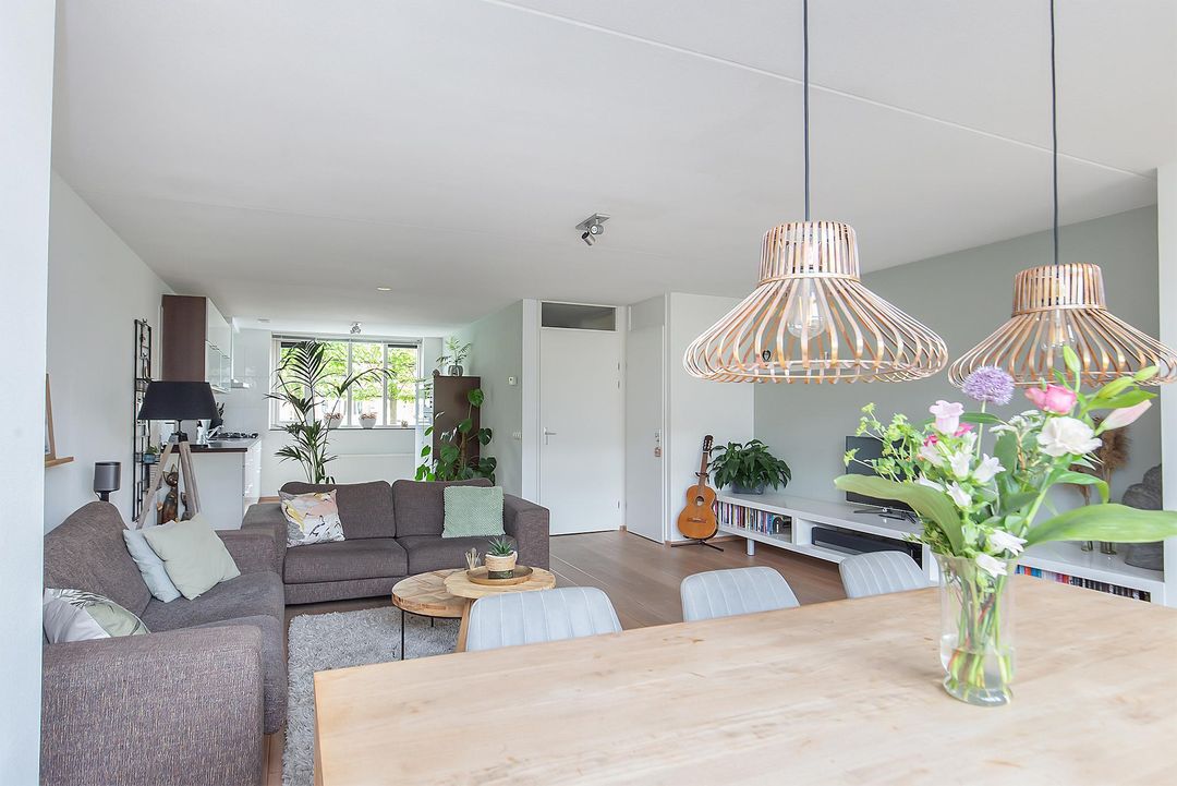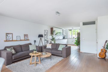 De woonkamer is een prettige en lichte leefruimte. De uitbouw over de volle breedte maakt het dat er meer dan voldoende leefruimte is. Zo heb je ruimte voor een leuk zitgedeelte en ook nog eens een apart eetgedeelte. De brede raampartij en de loopdeur zorgen voor een prettige lichtinval in deze ruimte. De aanwezige trapkast is ideaal voor extra bergruimte!
