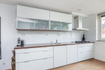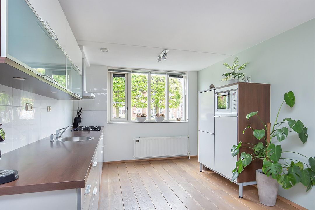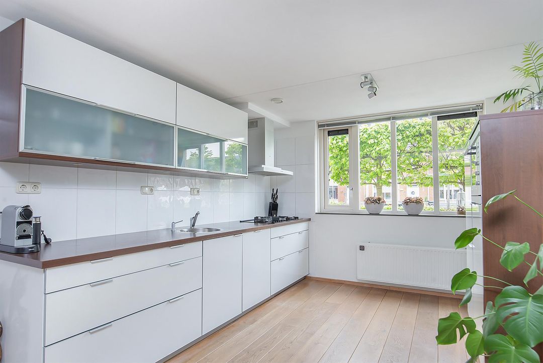De keuken bevindt zich aan de voorzijde van de woning. Een rechte stijlvolle opstelling die is gecombineerd met een bijpassende kastwand. De royale afmeting van het blad maakt het dat je hier royaal de ruimte hebt. Uiteraard is de keuken voorzien van diverse inbouwapparatuur, waaronder een 5-pitsgasfornuis, afzuiginstallatie, rvs spoelbak, vaatwasser, koel-vriescombinatie en combi-oven.