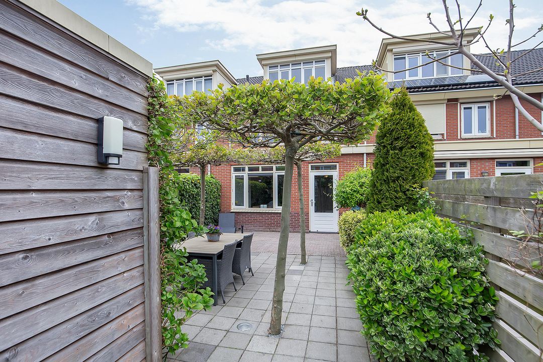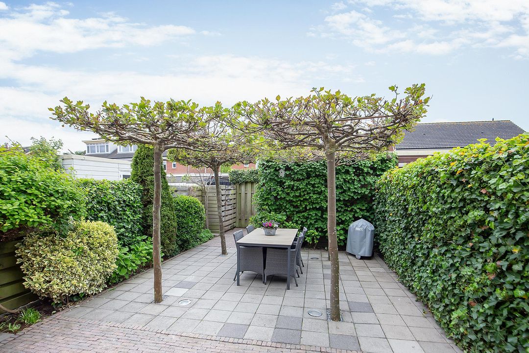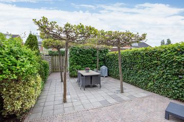 De achtertuin (10.62×5.55) is bijzonder sfeervol en groen! Gelegen op het zuidwesten, praktisch in het onderhoud door de sierbestrating, heeft een houten berging (3.23×2.75) én een eigen achterom.