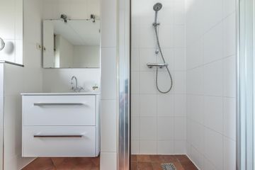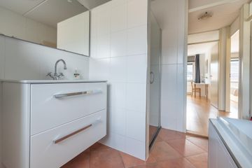 De badkamer is geheel betegeld met een lichte wandtegel, gecombineerd met een vloertegel in aardetint. Een nette ruimte en compleet ingericht! Hier heb je een ligbad met whirlpool functie, royale inloopdouche, 2e toilet en badkamermeubel.