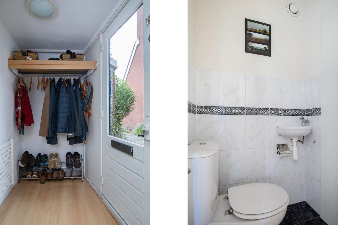 De toiletruimte is half betegeld met een wit gemarmerde wandtegel en een antracietkleurige vloertegel. De ruimte heeft een staand toilet, een fonteintje en een mechanisch ventilatiesysteem. Daarnaast heeft u deurtjes naar extra bergruimte in de trapkast.