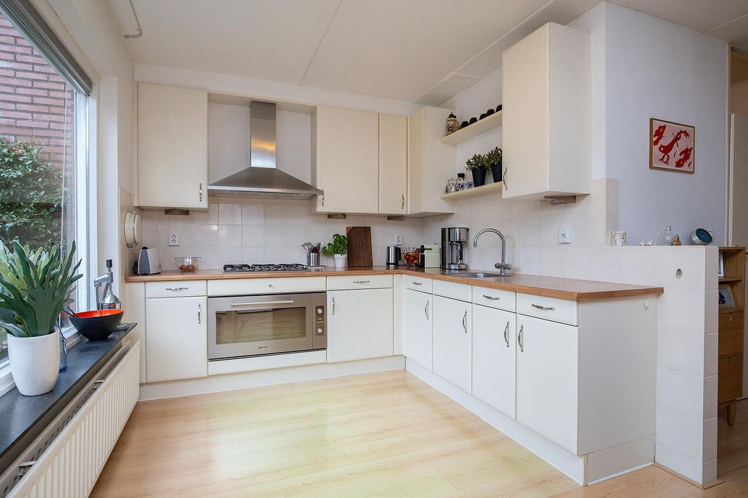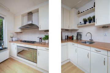 De keuken is gelegen aan de voorzijde van de woning en heeft door het grote raam een bijzonder prettige lichtinval. De keuken heeft een L-opstelling waardoor u aan werk- en opbergruimte absoluut geen gebrek heeft! Het kunststof werkblad heeft een houtlook en is voorzien van een rvs spoelbak en een 5-pits gasfornuis met daarboven een rvs afzuigkap. Daarnaast heeft de keuken een extra brede oven en heeft en een licht betegelde achterwand.